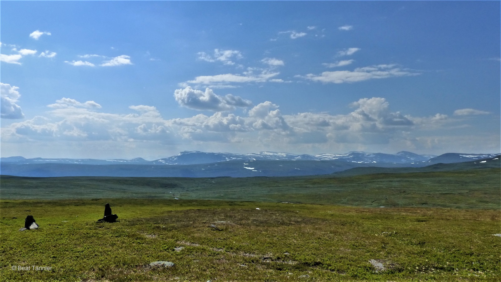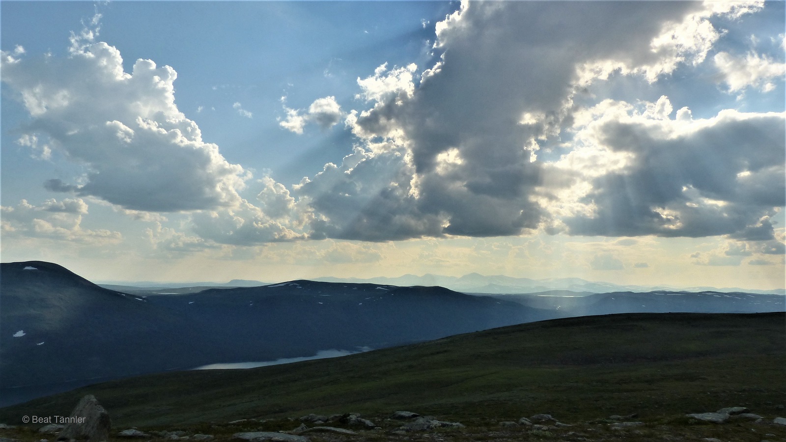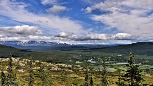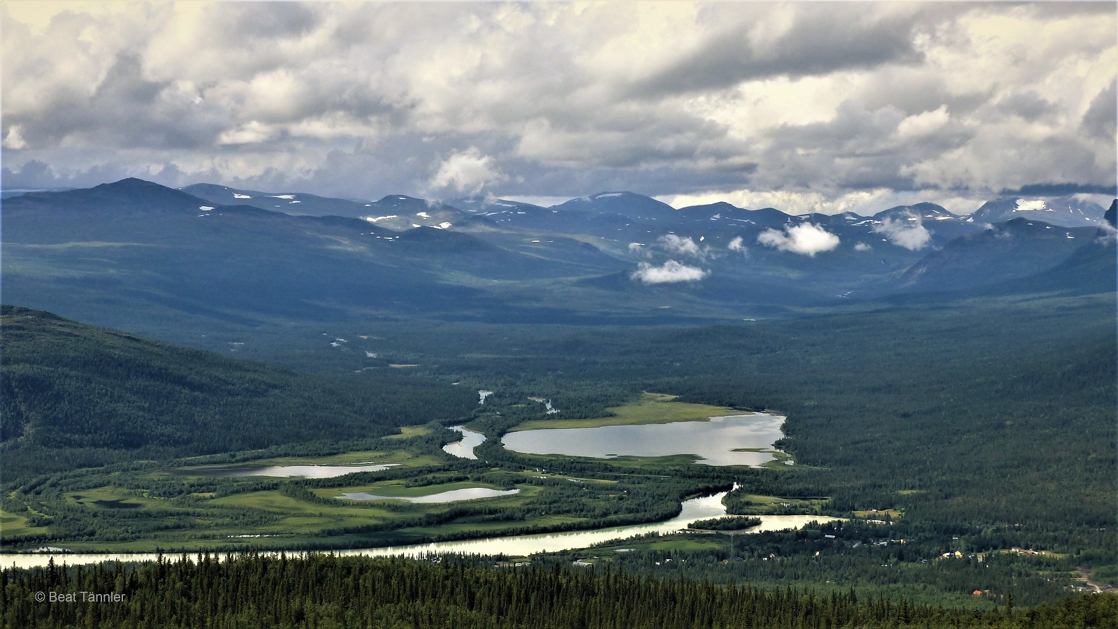 Auf einer Naturstrasse voller Schlaglöcher schaukelten wir auf den Nalovardo. Der Himmel verdüsterte sich zusehends. Trotzdem wagten wir einen Spaziergang und wurden belohnt. Auf dem Gipfel genossen wir die herrliche Aussicht auf den Vindelälven und und die umliegenden Berge. Die herrschende Gewitterstimmung liess alles noch viel eindrücklicher erscheinen.