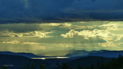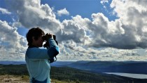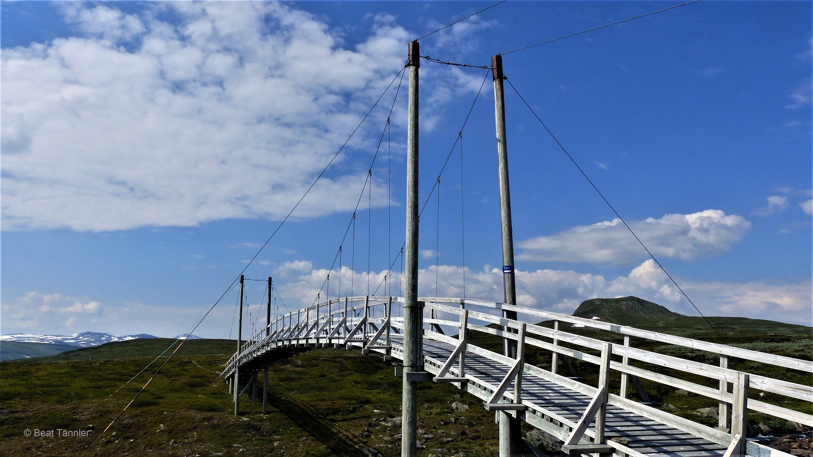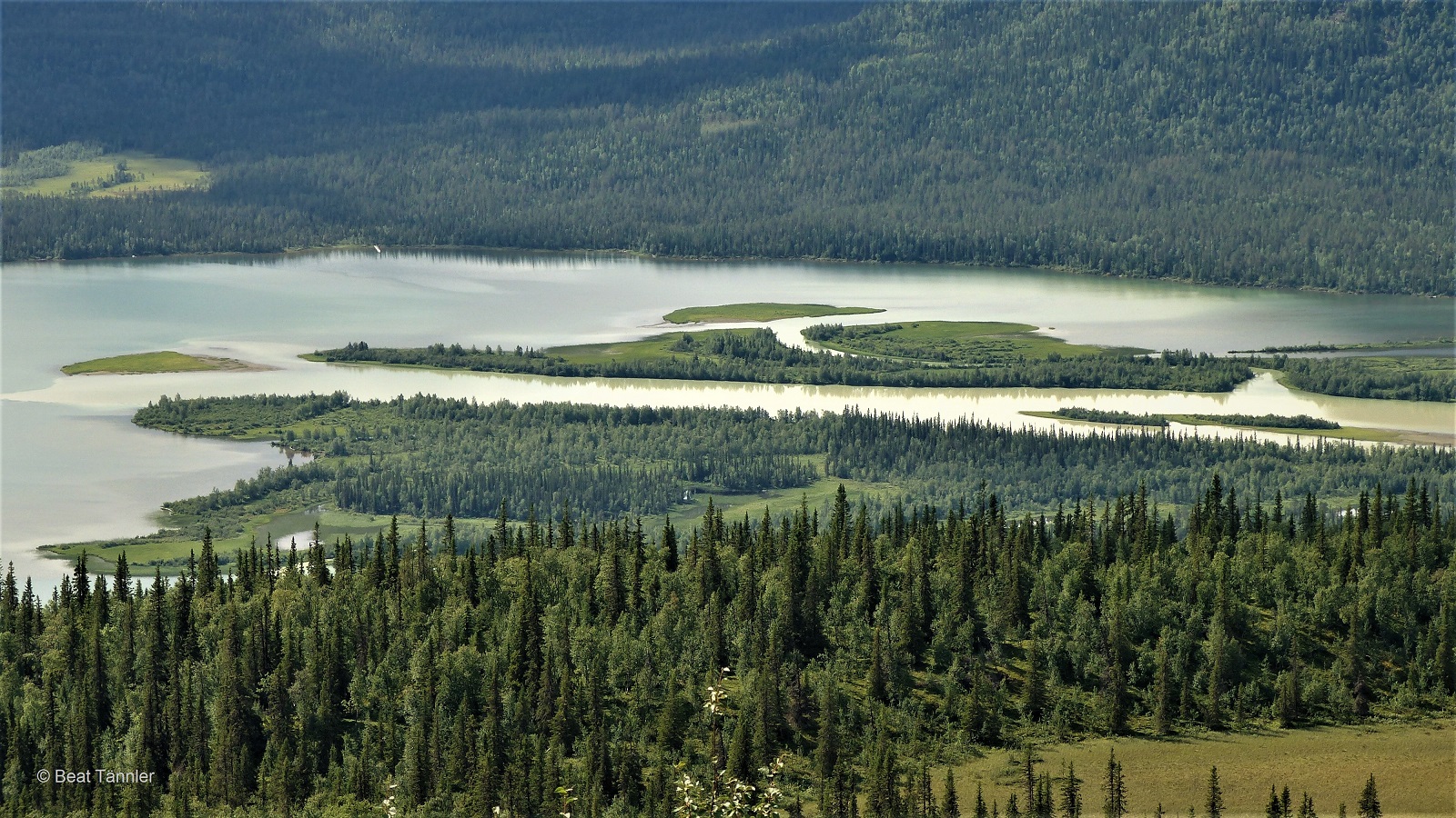 Auf einer Naturstrasse voller Schlaglöcher schaukelten wir auf den Nalovardo. Der Himmel verdüsterte sich zusehends. Trotzdem wagten wir einen Spaziergang und wurden belohnt. Auf dem Gipfel genossen wir die herrliche Aussicht auf den Vindelälven und und die umliegenden Berge. Die herrschende Gewitterstimmung liess alles noch viel eindrücklicher erscheinen.