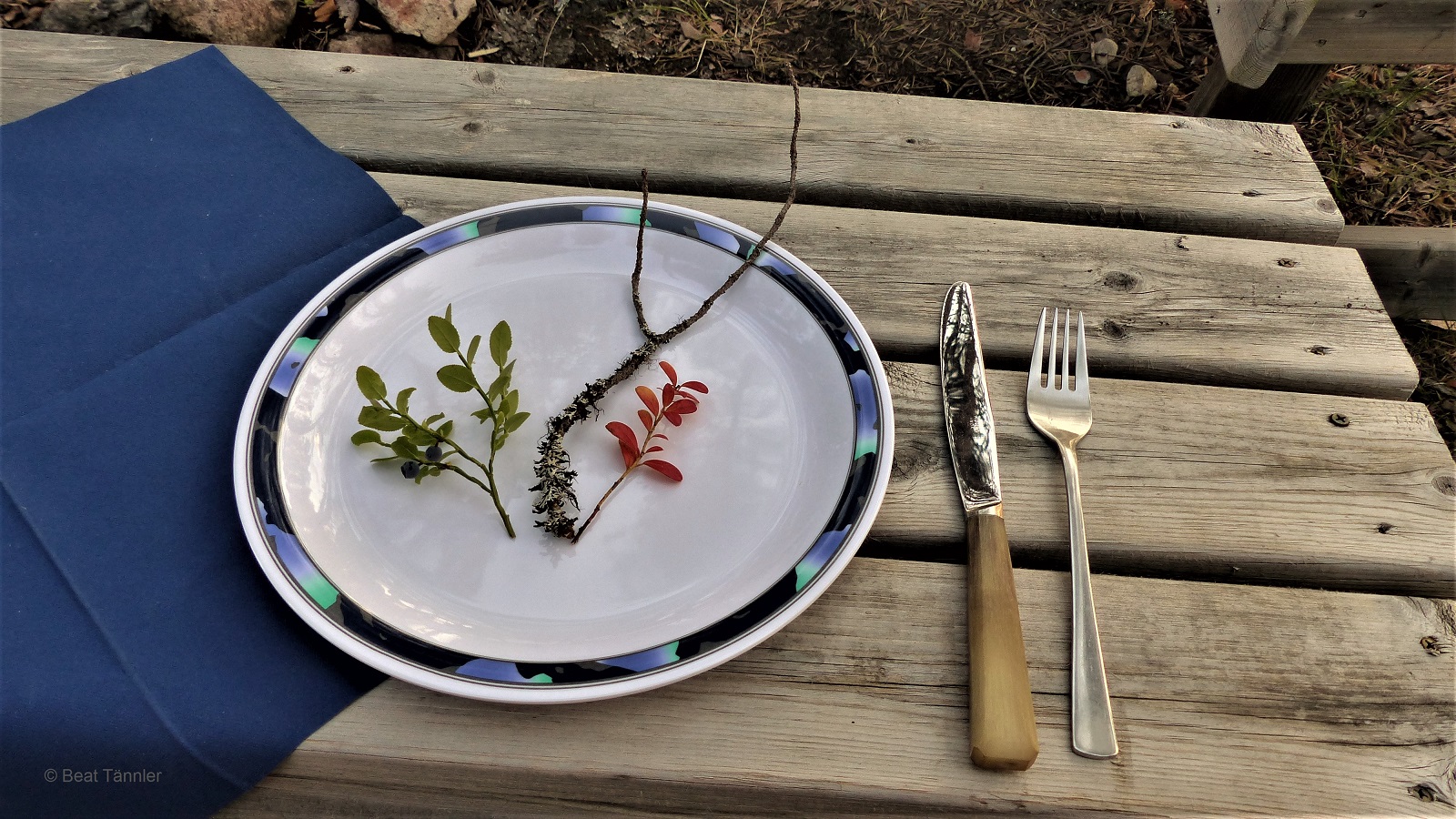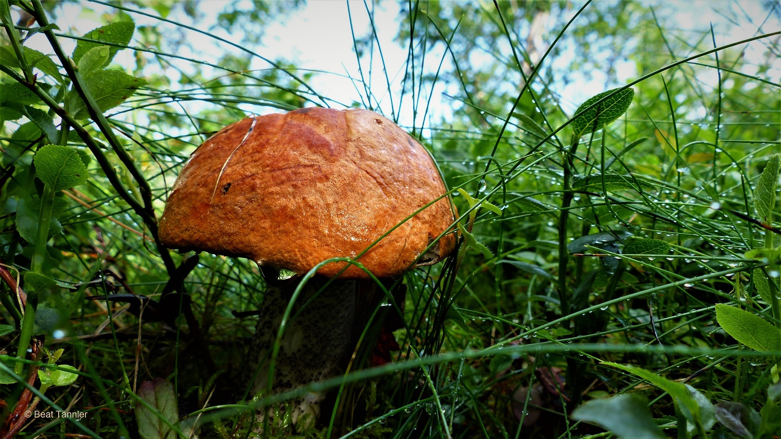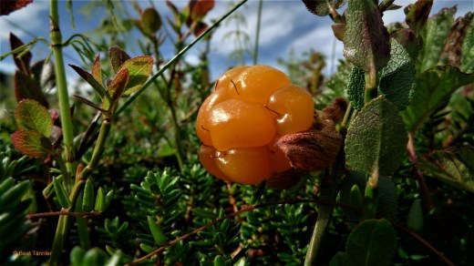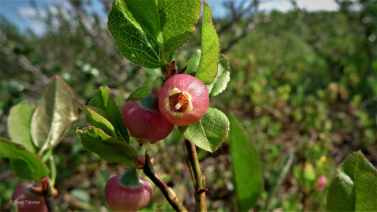 Kurz nach dem Dorf sammelten wir Heidelbeeren. Beat in Shorts und ohne T-Shirt wird von den Mücken und Knots (kleine fliegende Blutsauger) beinahe aufgefressen. Es war wieder um die 30 °C heiss. Annette fand zudem einige Pilze (Heiderotkappen) für das Abendessen.