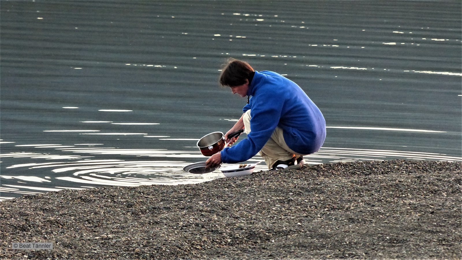 Er begleitete uns ein kurzes Stück und schon legten wir wieder an. Bei einer Goldwäscherin und Künstlerin bekamen wir Kaffee und frische Waffeln serviert. Sie betreibt im Sommer in einem Partyzelt DEN Treffpunkt des Tals. Damit bei Regen das Wasser sicher vom Zelt rinnt, hat sie auf dem Tisch einige Besen verkehrt herum aufgestellt, die die Plane nach aussen drücken.