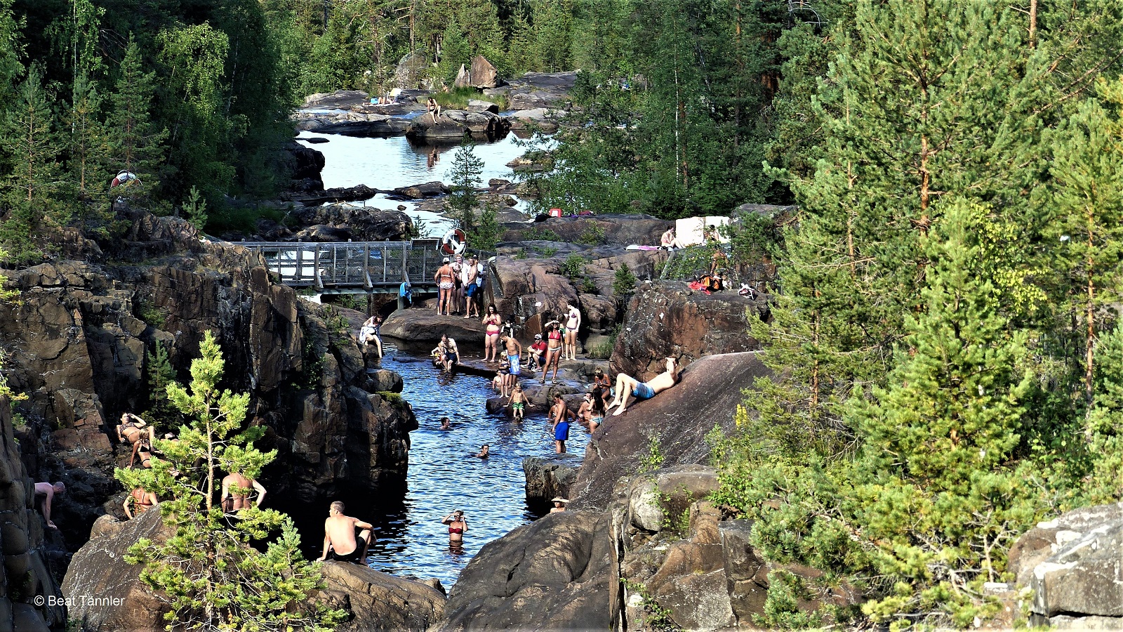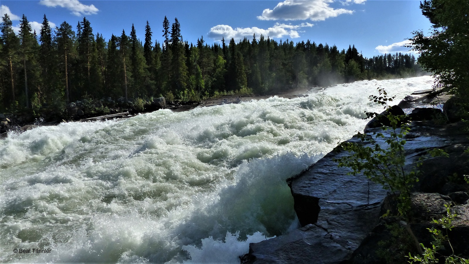Wir wanderten neben den Stromschnellen flussaufwärts. Der Storforsen am Piteälven ist ein gewaltiges Naturspektakel. Hier fallen ca. 850 m³/s Wasser auf einer Länge von 600 Metern 50 Meter tief. (Zum Vergleich, Wassermenge des Rheinfalls im Sommer: ca. 700 m³/s)
