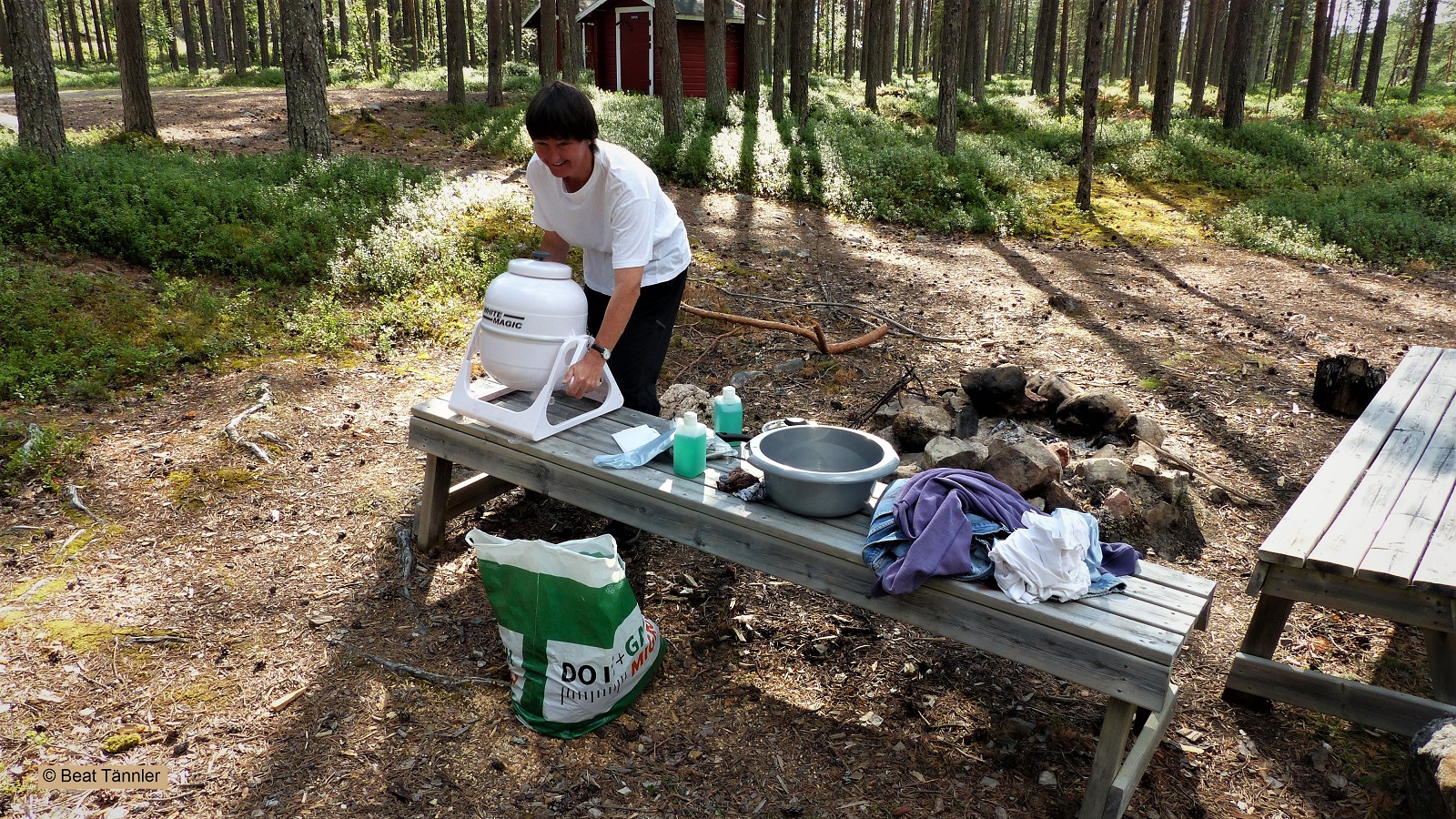 Wir füllten unsere Hand-Waschmaschine sieben Mal. Zum Spülen wanderte Annette jeweils die 200 Meter zum Fluss und Beat drehte derweil fleissig an der Maschine und hängte die nasse Wäsche im Wald auf.