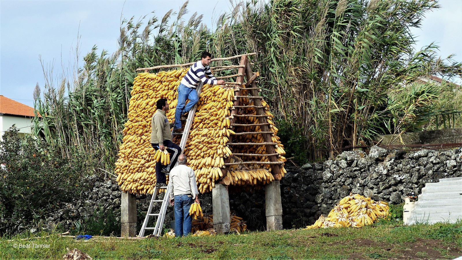 Im Herbst werden die Maiskolben an Gestellen zum Trocknen aufgehängt. Sie dienen als Futter für die Hühner, die sich viele Dorfbewohner zur Selbstversorgung halten.