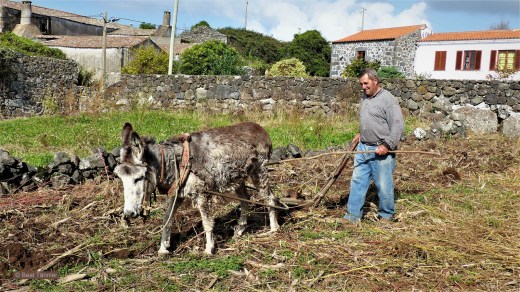 Annette fragte den Bauern, ob wir ihn beim Pflügen fotografieren dürften. Sie erklärte ihm, dass es in der Schweiz nicht so fleissige Esel gebe wie hier auf Graciosa. Der Landwirt war sichtlich stolz, fotografiert zu werden, der Eselin dagegen schien das ganze Getue egal zu sein. Vielleicht ist sie es aber nur nicht gewohnt, Gefühle offen zu zeigen.