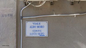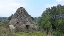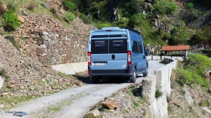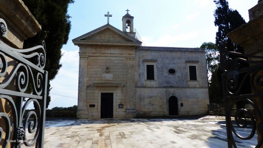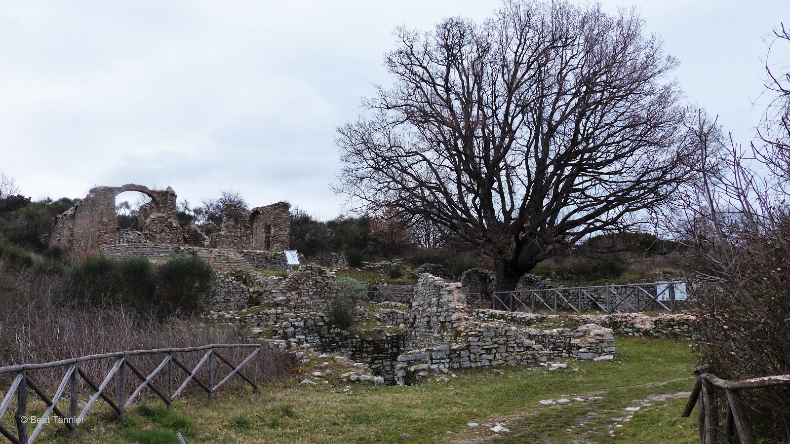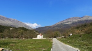 Unterwegs sehen wir einen schmalen, asphaltierten Weg, der zum Kloster „Manesteri San Thodori“ führen soll. Wir folgen dem Wegweiser und gelangen nach ca. zwei Kilometern zu einem ruhig gelegenen Parkplatz. Zum „Kloster“ hinauf führt ein breiter Weg, der mit schönen Steinplattten belegt ist. Wir betreten den Klosterhof. Die Klinken am Tor sind zwar abgebrochen, aber man kann das Schloss noch öffnen. Die Gebäude sind nur noch Ruinen und es gibt keinerlei Informationen. Es ist fragwürdig, warum der aufwändige Weg angelegt wurde.