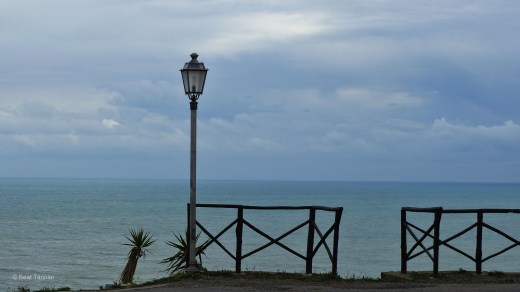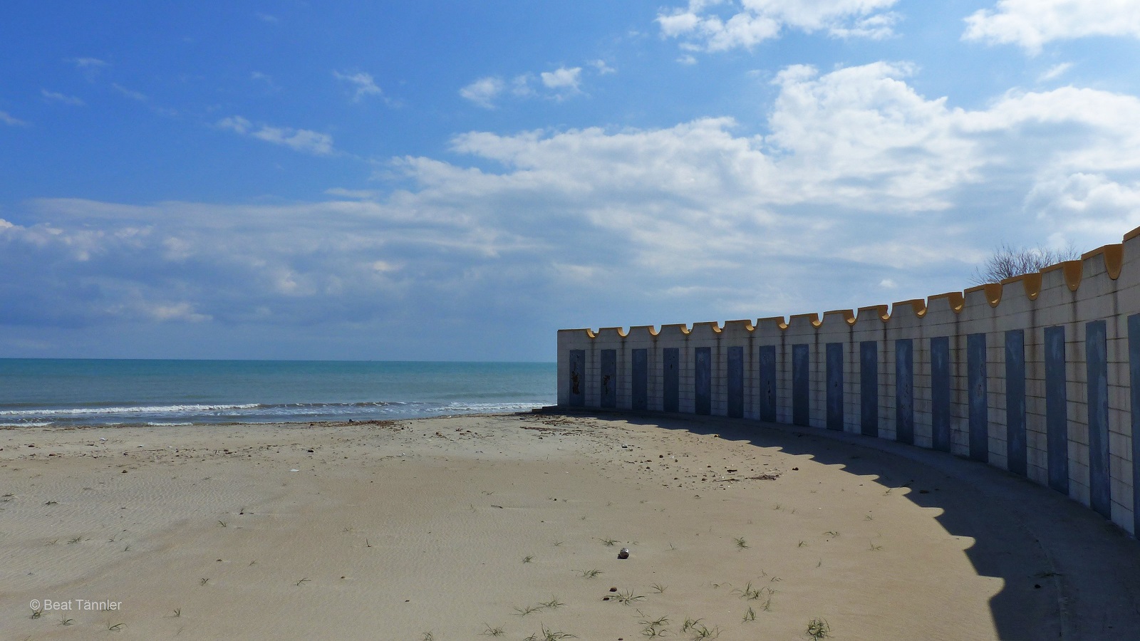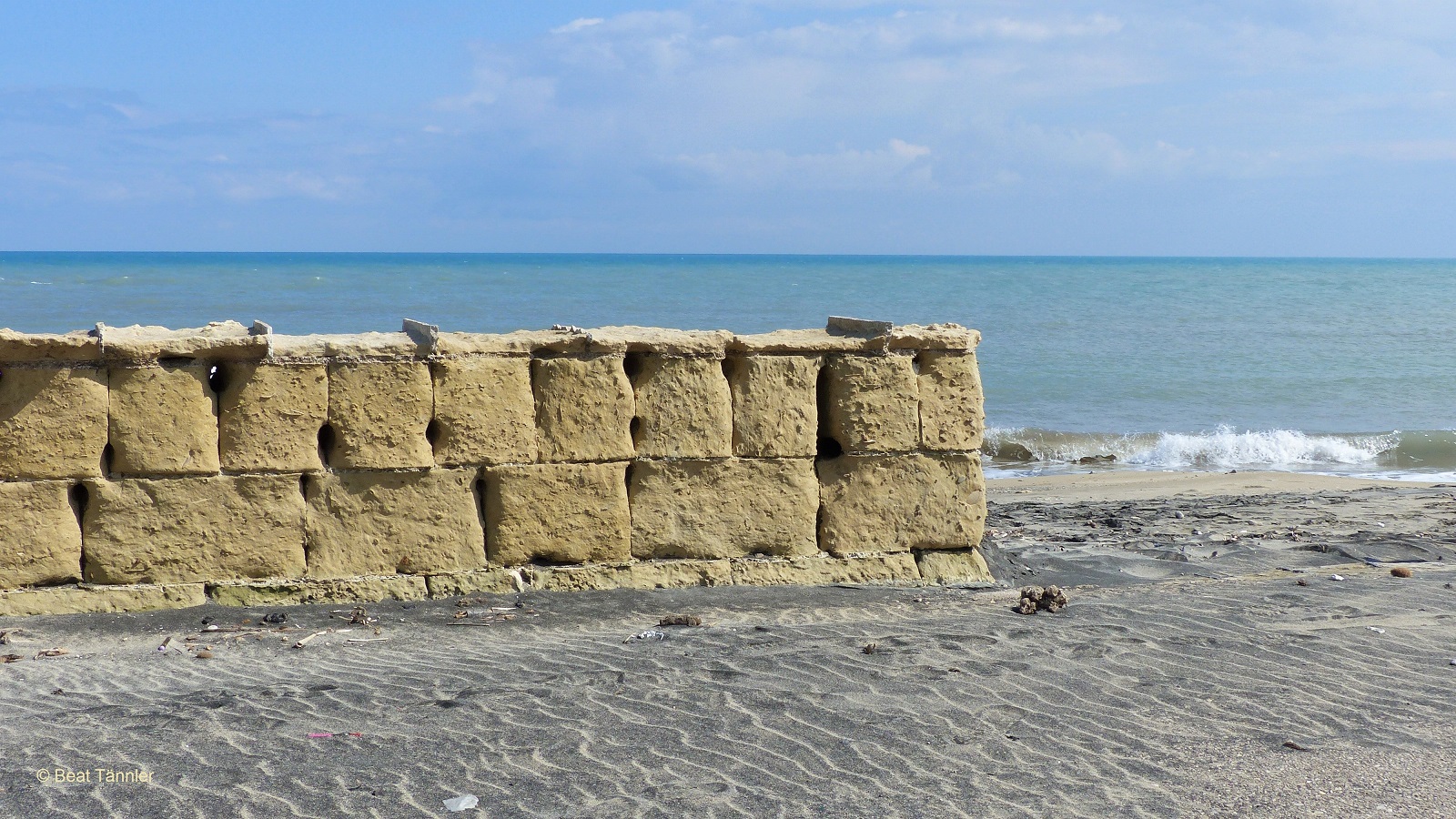 Am Strand spazieren wir diesmal in die andere Richtung. Hier steht eine Reihe einfacher Bars und Restaurants. Im Sommer muss da die Post abgehen.