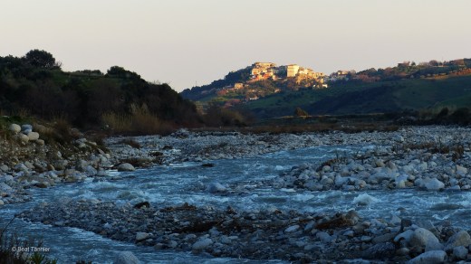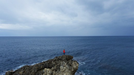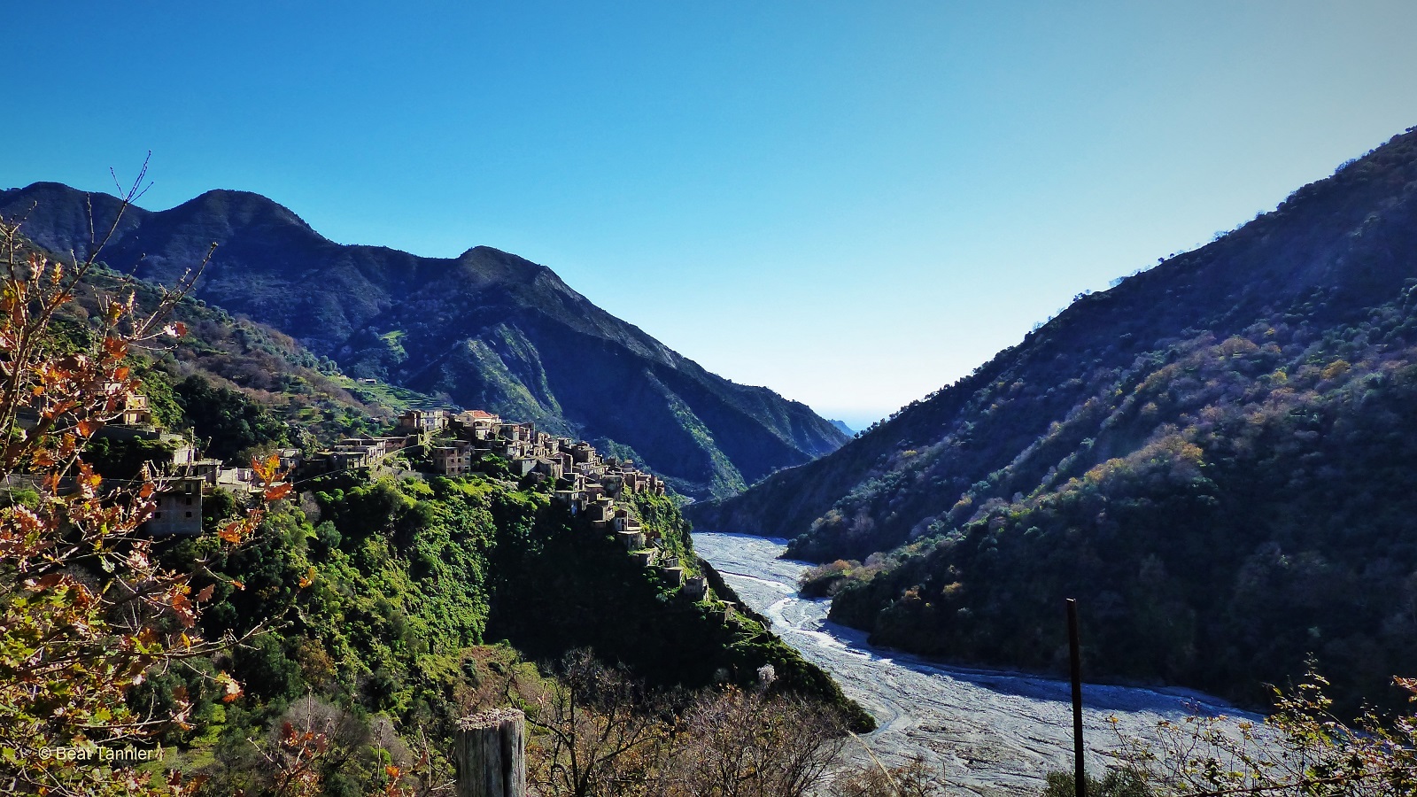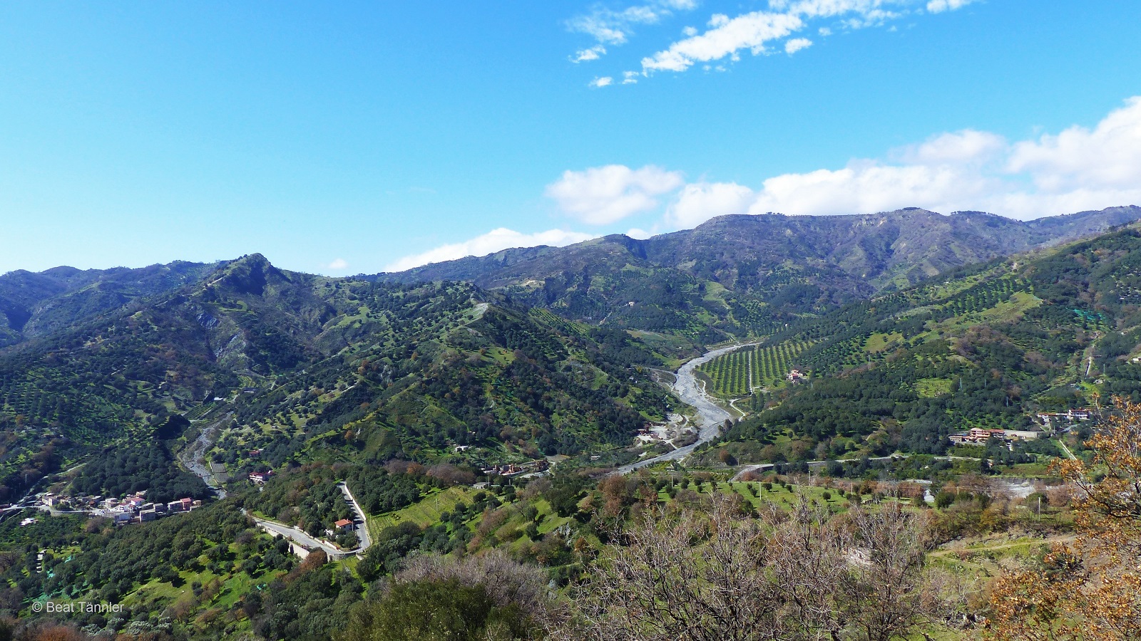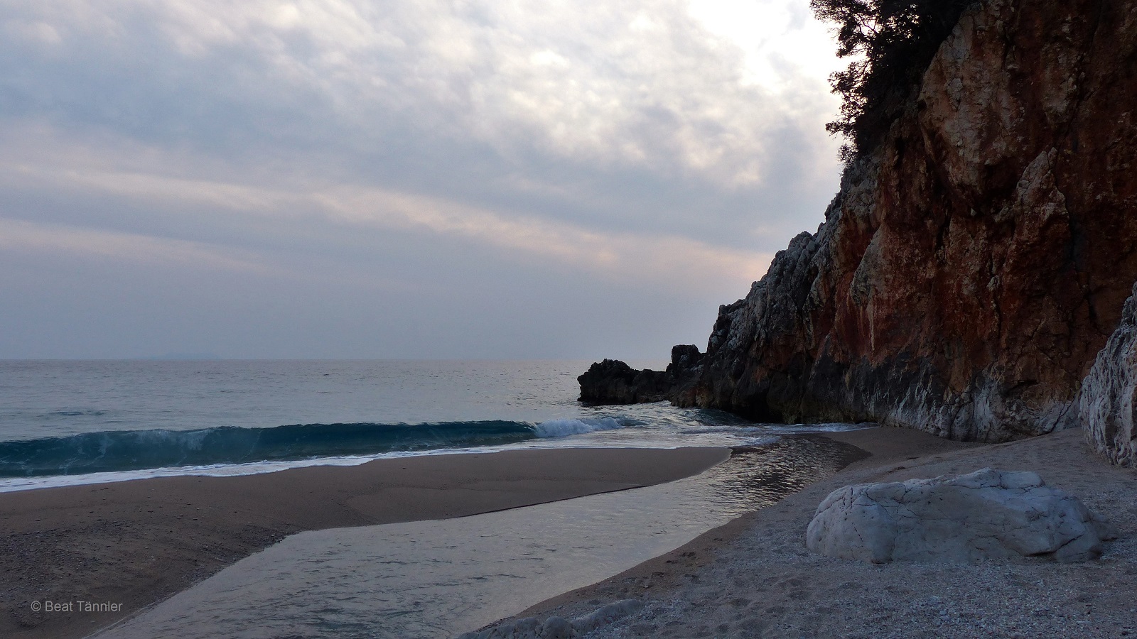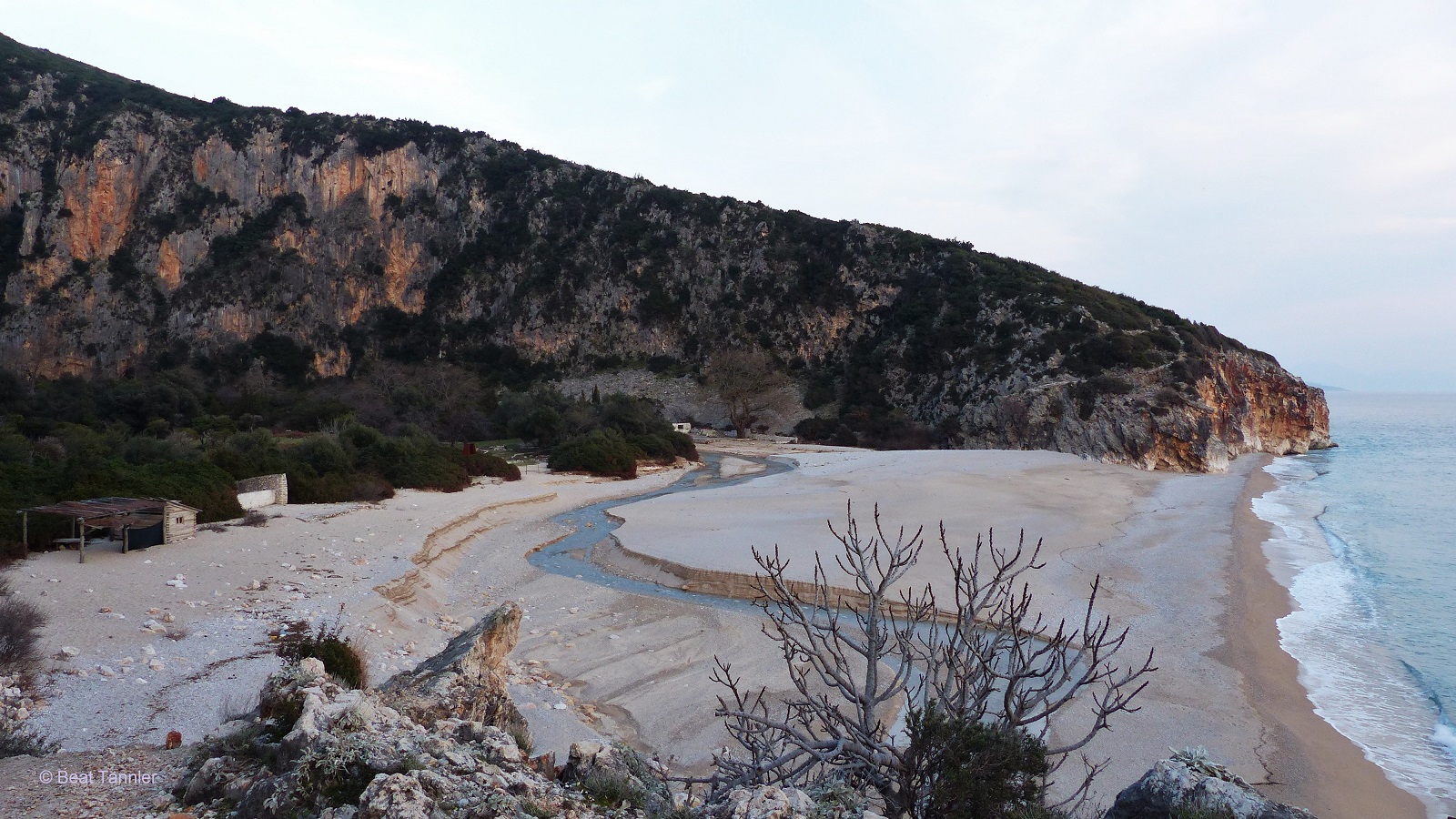 Wir beschliessen hier zu schlafen. Zuerst wollen wir uns aber noch etwas bewegen. Wir folgen einem Weg, der zum Meer hinunter zu führen scheint. Nach etwa dreiviertel Stunden sehen wir von oben eine einsame Bucht mit Sandstrand, durch den ein Bach ins Meer fliesst.