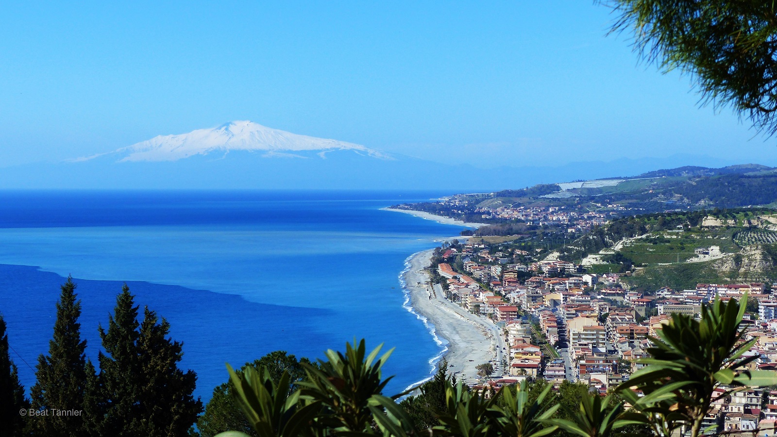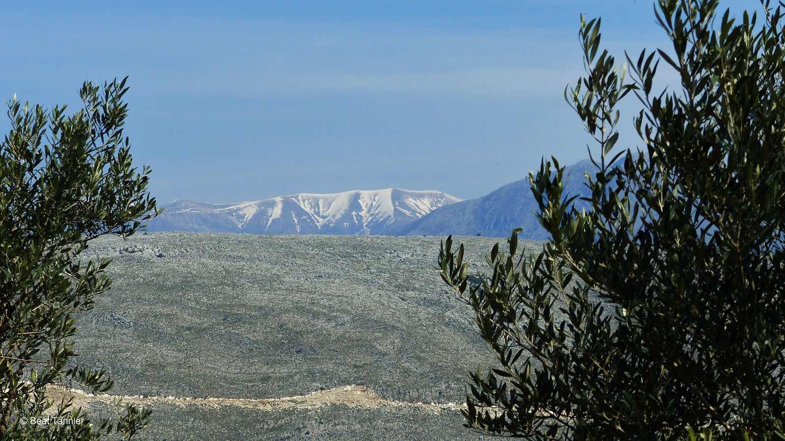 Nun fahren wir durch eine karge Landschaft, hinter der malerisch ein Schneeberg hervorlugt. Immer wieder sind ganze Hügelzüge terrassiert.