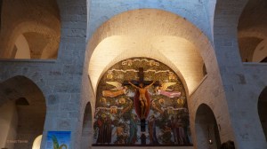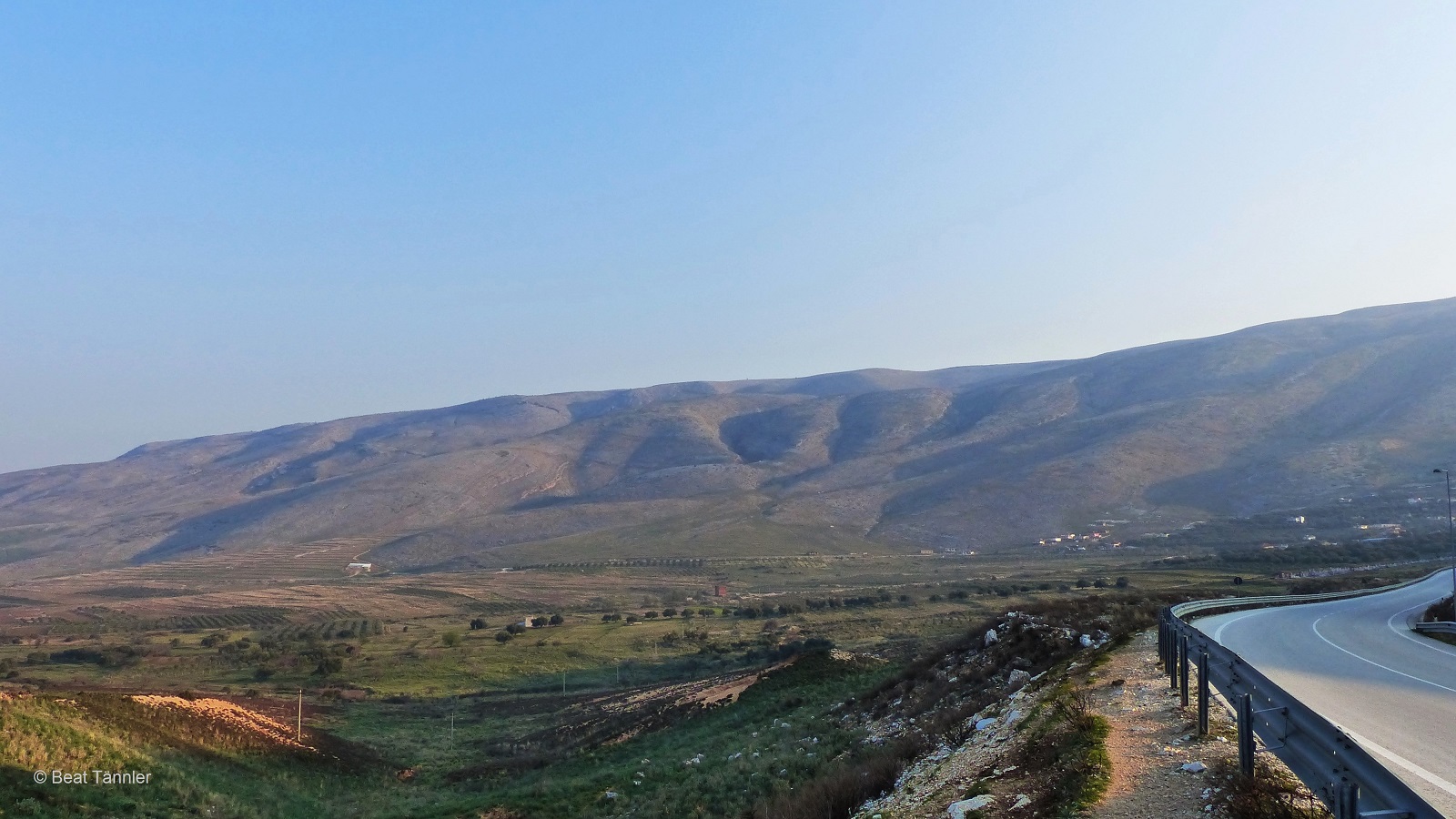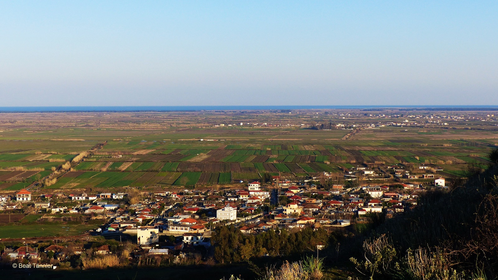 Danach fahren wir weiter nach Apollonia (bei Fier). Wir sind spät unterwegs und es wird bereits Nacht. Die Strasse ist in einem guten Zustand. Einzig auf die dunkel gekleideten Fussgänger, Velofahrer und unbeleuchteten Traktoren (zum Abbiegen schwenkt man die dunkelgraue Mütze) muss man aufpassen.