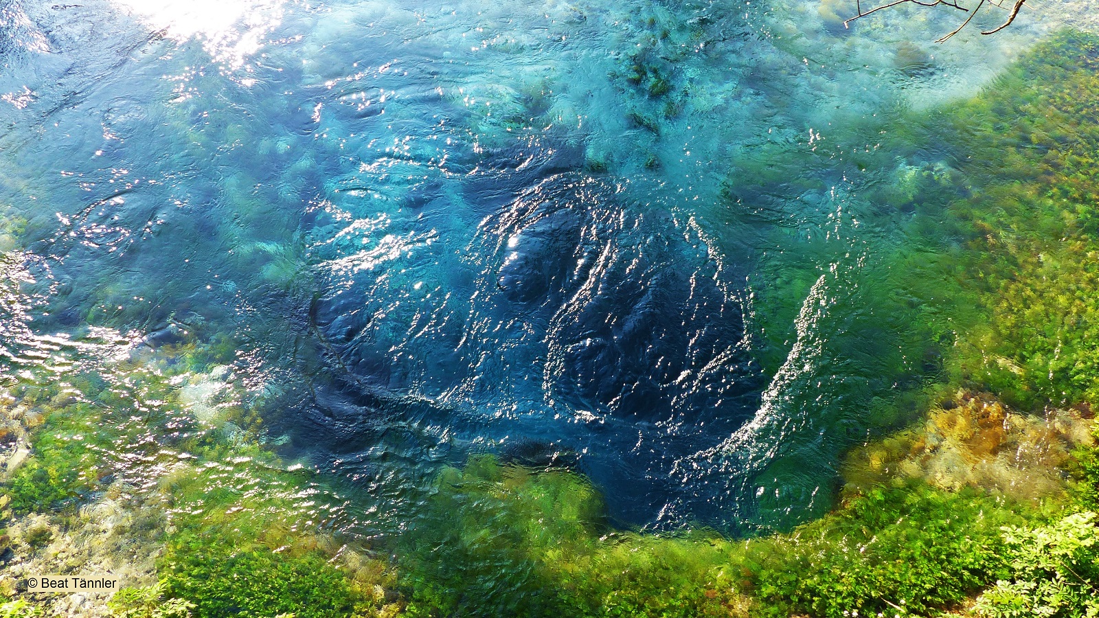 Dort drückt das Wasser mit riesiger Kraft senkrecht aus dem Boden. Pro Sekunde sprudeln rund 7.5 m³ (umgerechnet 50 Badewannen voll, pro Sekunde!!!) 10 °C kaltes Wasser aus dem Boden. Wie tief die Quelle ist, weiss man nicht.Wegen dem enormen Wasserdruck konnten bisher erst die obersten 50 Meter erforscht werden.