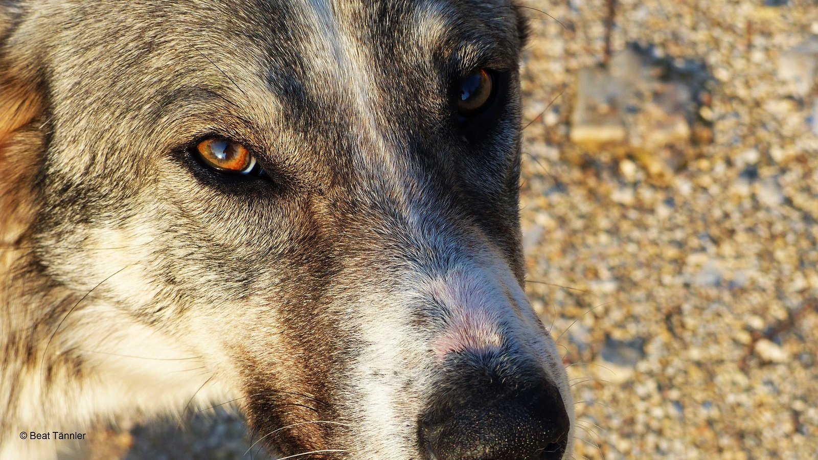Zum Dank schenken wir dem armen ungestreichelten Husky, der hierher zu gehören scheint, einige Streicheleinheiten und sammeln, wie immer an unseren Übernachtungsplätzen, herumliegenden Müll ein.