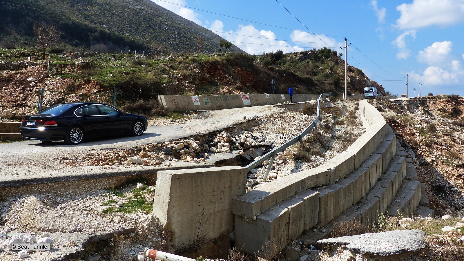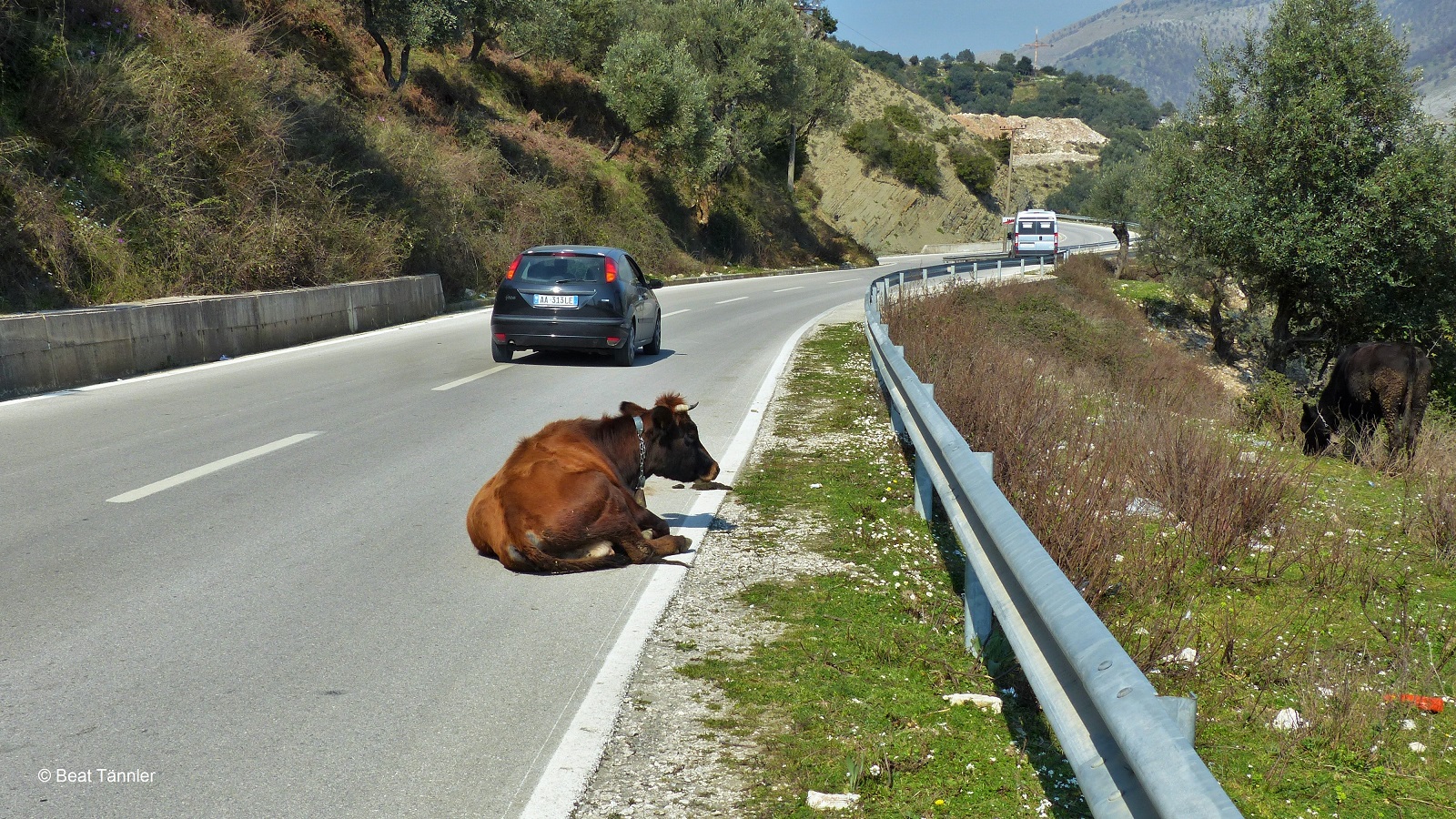 Beat fotografiert und ein Auto hält an. Ein Albaner fragt ihn zuerst auf albanisch, dann auf englisch, ob dies der Weg nach Vlorë sei. Beat antwortet, dass er dies hoffe, da wir selber dorthin fahren wollten. Der Mann lacht und findet es „funny“, dass er als Albaner einen Ausländer nach dem Weg fragt. Als er hört, dass wir aus der Schweiz kommen, findet er es gar „crazy“, dass ein Schweizer in Albanien Kühe fotografiert. Lachend fährt er weiter.