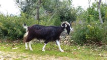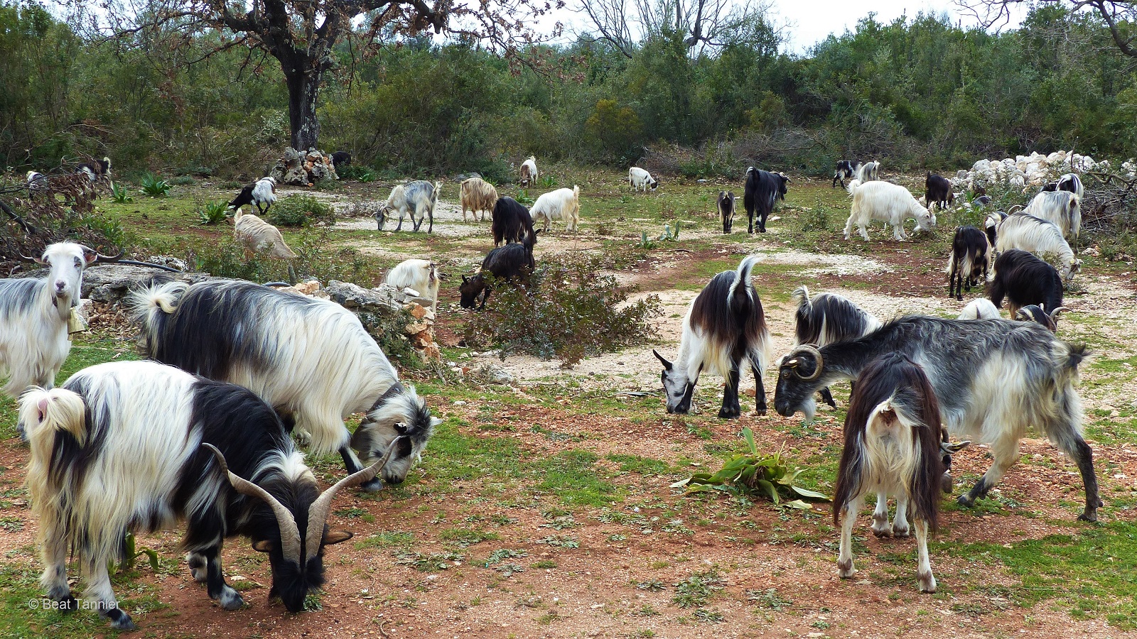 Plötzlich hören wir Rufe, Pfiffe und Glockengebimmel. Eine Hirte zieht mit einer Ziegenherde an unserem Wohnmobil vorbei. Annette fragt den Mann (mit Aufsagen der Zahlen von 1 bis 10 und fragenden Gesten), wieviele Tiere er hüte. Er schreibt mit seinem Hirtenstab die Zahl in den Sand: 178.