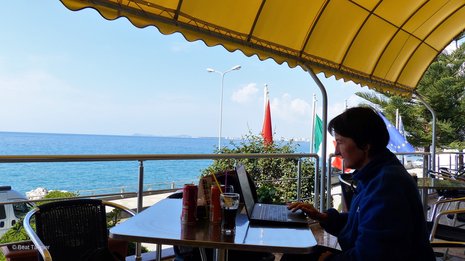 Kurz vor Vlorë finden wir ein Restaurant mit Bar, wo wir auf der Sonnenterrasse einen Internetzugang erhalten.