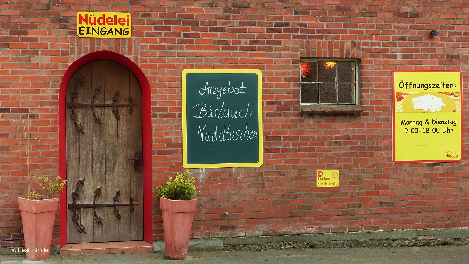 Gestern Abend sind wir im Dorf Bevern an einer „Nudelei“ vorbeigefahren. Heute kaufen wir dort ein. Das Sortiment an Bio-Frischnudeln ist gross. Wir entscheiden uns für Ravioli (Nudeltaschen). Um die Qual der Wahl etwas zu mindern, wählen wir gleich drei Sorten: Bärlauch-Ricotta, Walnuss-Gorgonzola und Zitronen-Ricotta.
