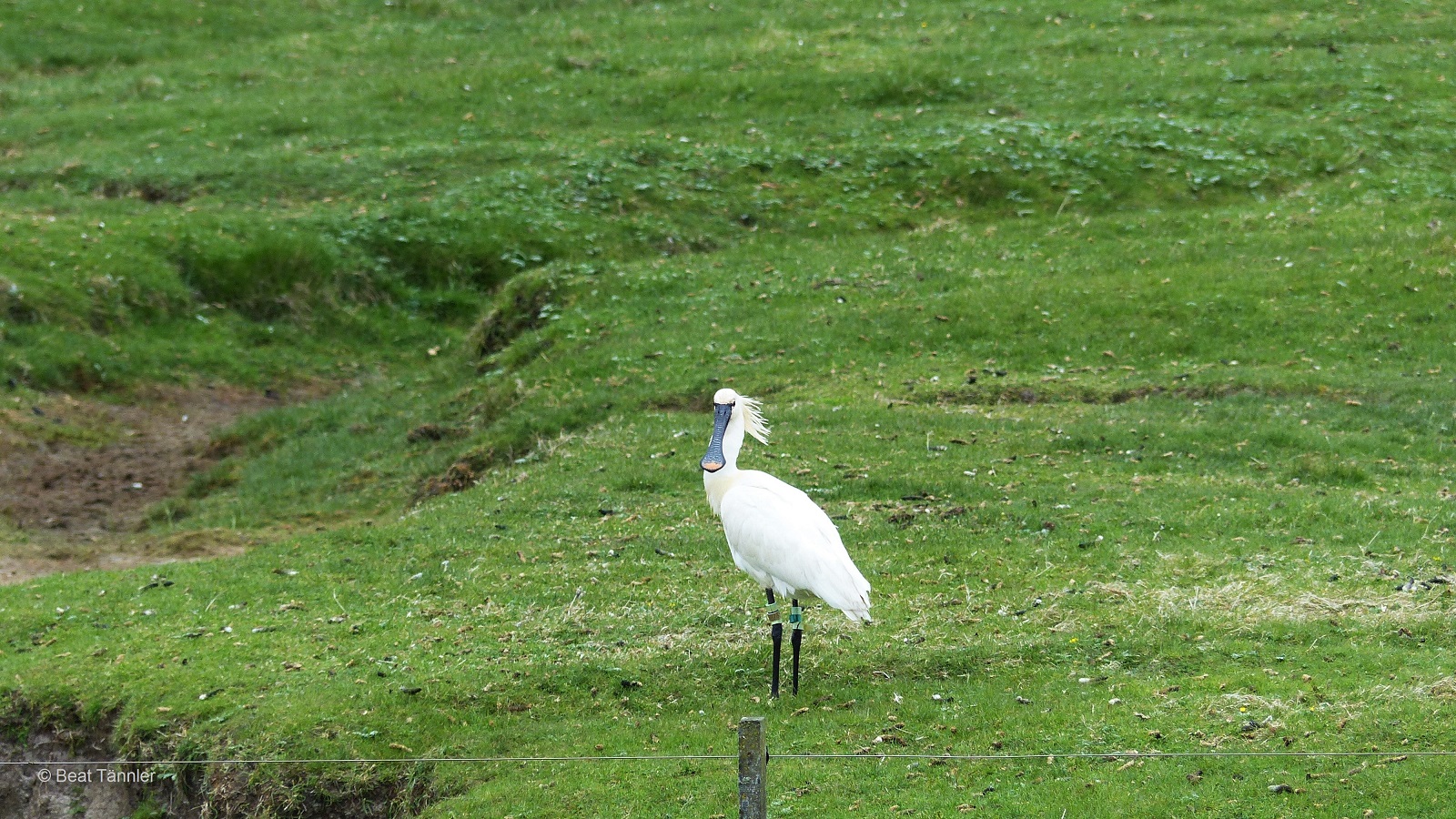 Aus all den tausenden von Gänsen sticht ein weisser, grosser Vogel heraus. Wir bestaunen den Löffler, der seinen Namen dem breiten, löffelartigen Schnabel verdankt. Er scheint eine berühmte Persönlichkeit zu sein, trägt er doch an beiden Beinen auffällige Ringe.