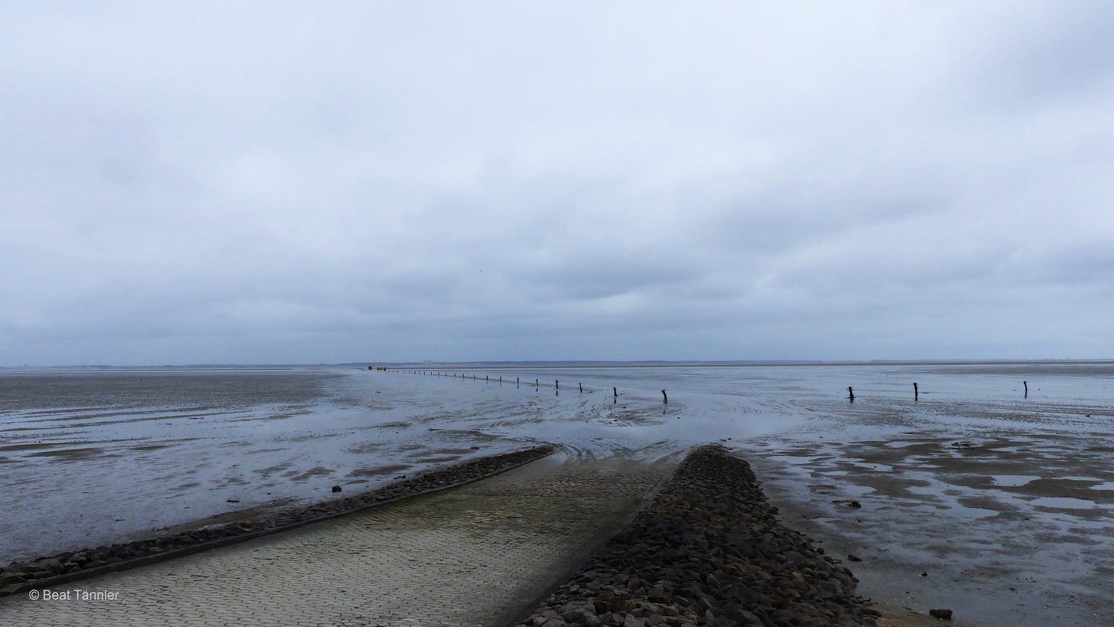In rund zwei Stunden ist Niedrigwasser und das Meer hat sich soweit zurückgezogen, dass wir um 14:15 Uhr losmarschieren können.