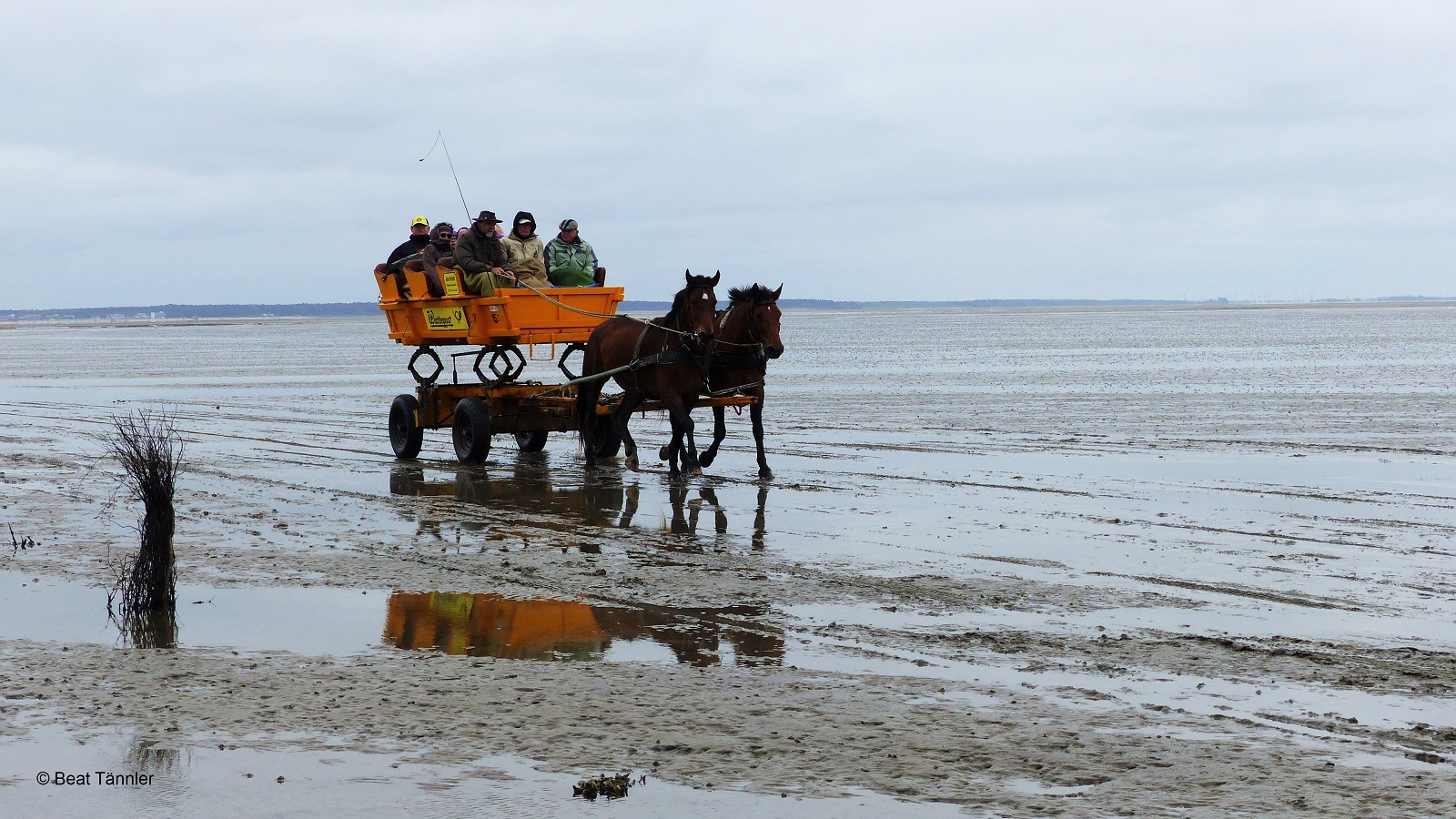 Wir sind nicht die einzigen unterwegs. Die Feriengäste der Hotels auf der Insel werden in Pferdekutschen vom Festland abgeholt und zurückgebracht. Auch einige Reiter nutzen die Stunde für einen Ritt übers Meer.