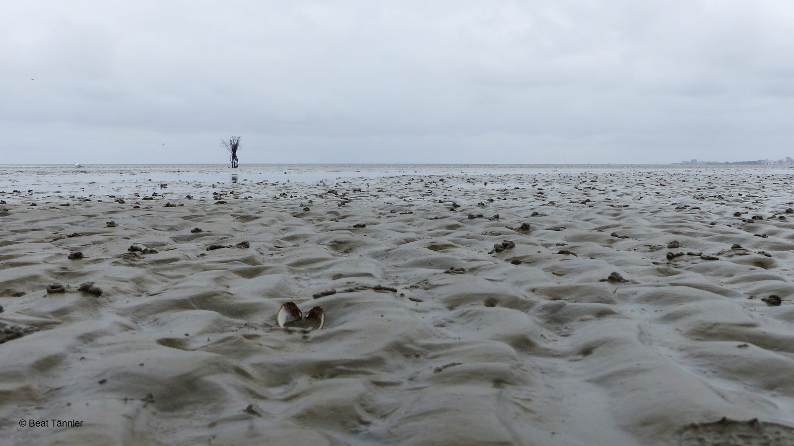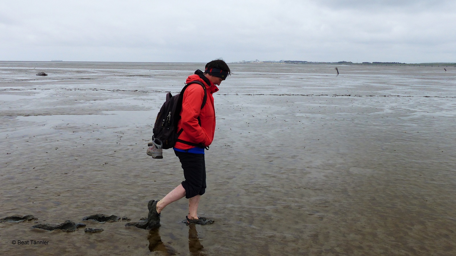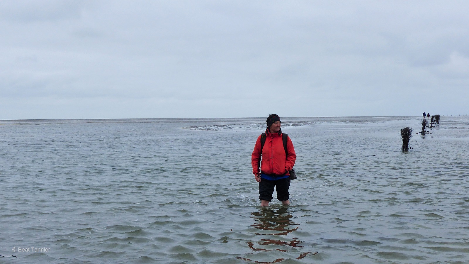 Auch der Meeresboden ist nicht topfeben. Wir queren Priele (Flüsse durchs Watt) und wandern über leicht schlickigen Grund.