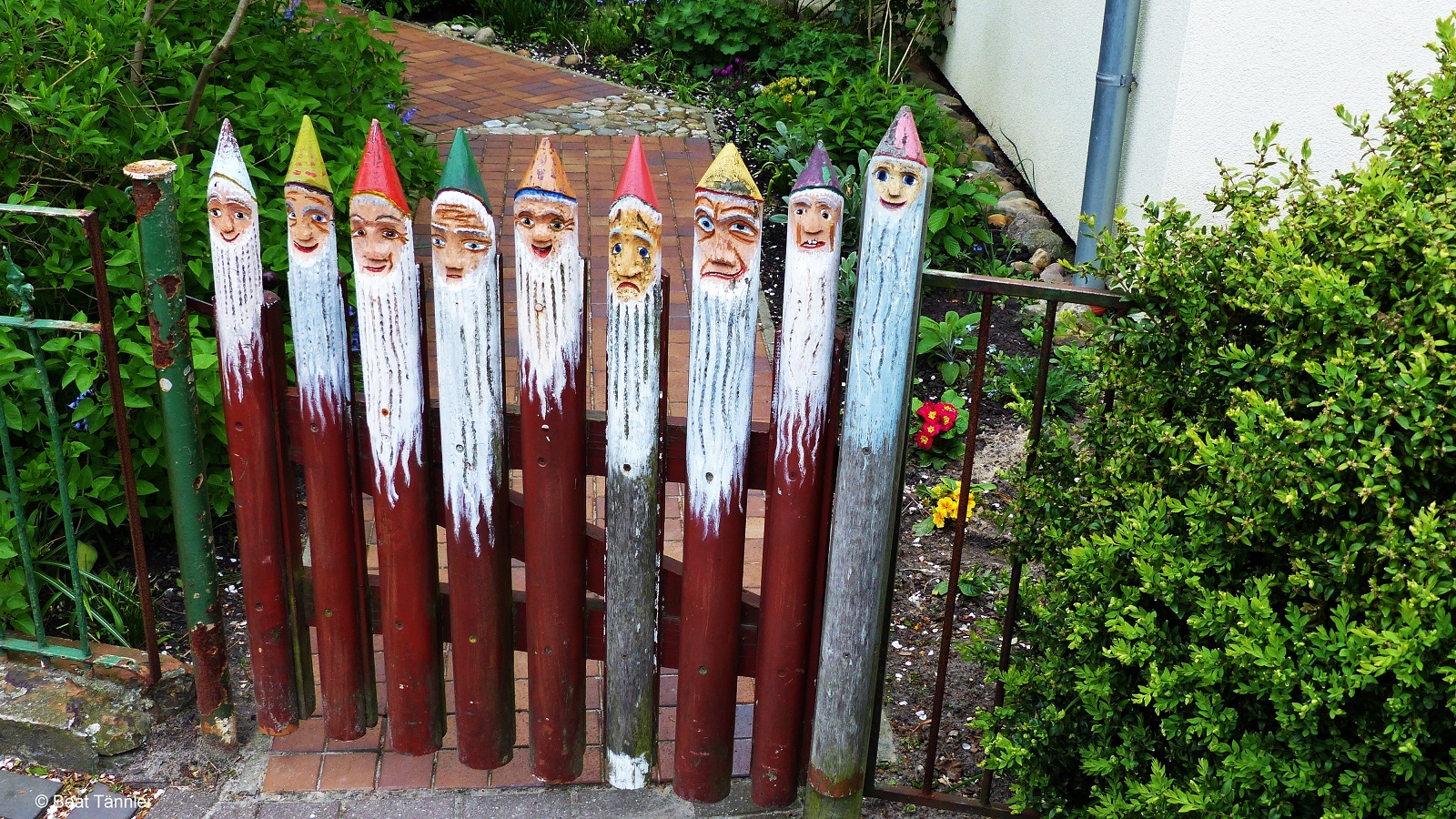 Wir haben sogar noch Augen für das märchenhafte Gartentor vor einem Waldorf-Kindergarten. Die Zwerge wurden in liebevoller Arbeit in die Holzlatten geschnitzt und bemalt.