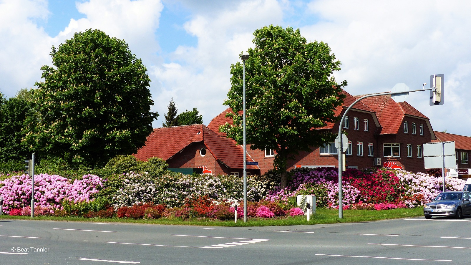 Das Wetter ist sehr launisch. Regen wechselt in rascher Folge mit Sonnenschein. Wir nutzen die drei Tage für Arbeiten am Blog. Kleinere Spaziergänge dazwischen zeigen, dass Westerstede den Zusatz „Rhododendron-Stadt“ zu Recht trägt. Überall zwischen den Häusern, auf dem Land und selbst im Wald blühen diese Pflanzen zur Zeit üppig in den unterschiedlichsten Farben.