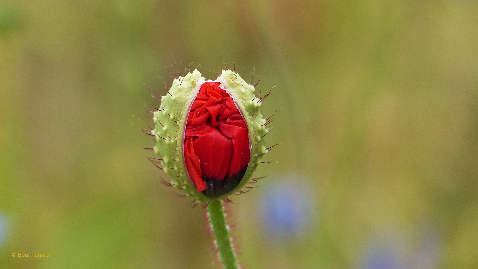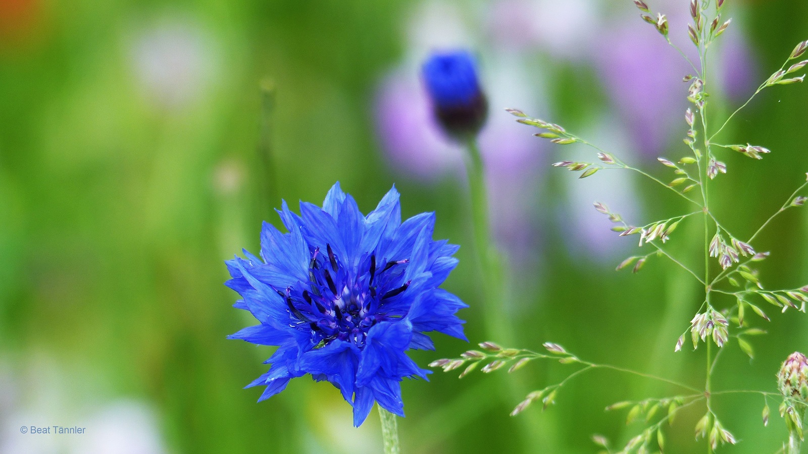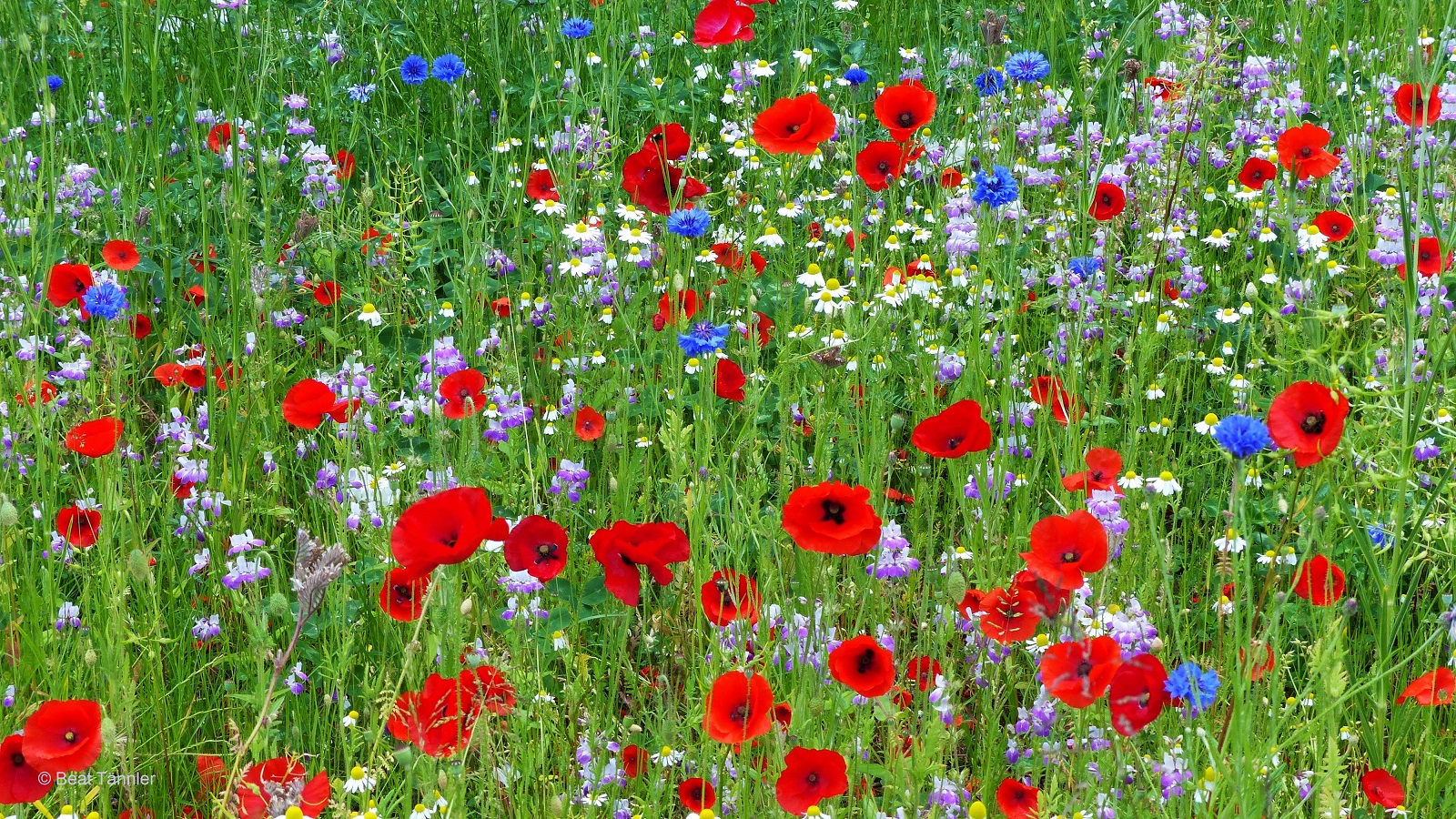Unter den vielen Mohnblumen entdecken wir sogar ein Exemplar mit „Schweizerkreuz“. Doch auch die Kornblumen und Kornrade sind ausserordentlich schön.