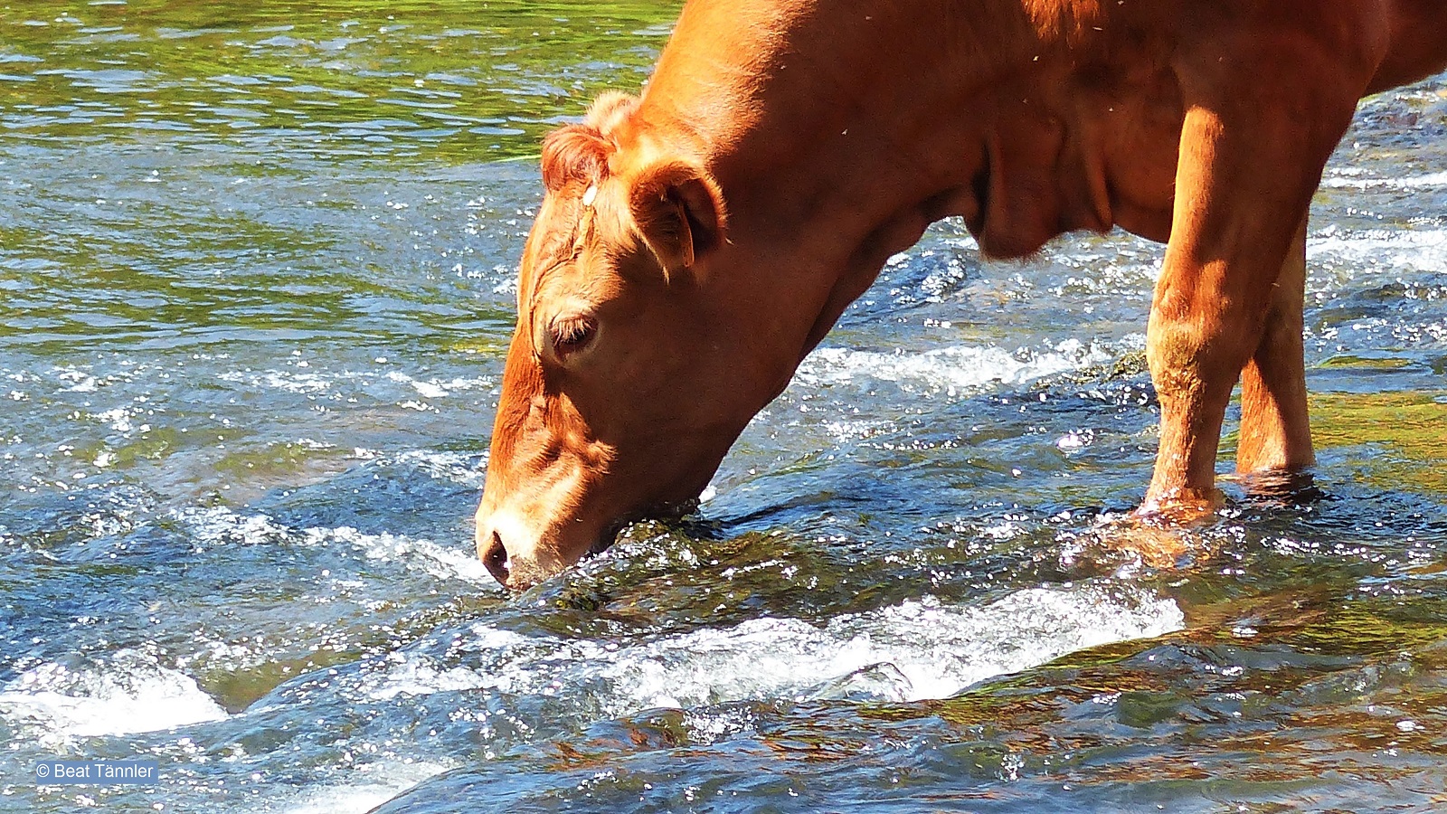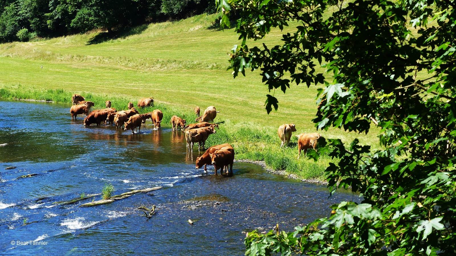 Auf unserer Fahrt sehen wir schöne, rotbraune Kühe, die an der Sûre Wasser trinken. Das ist für uns als ehemalige Rinderhirten natürlich ein Stopp und zwei Fotos wert.