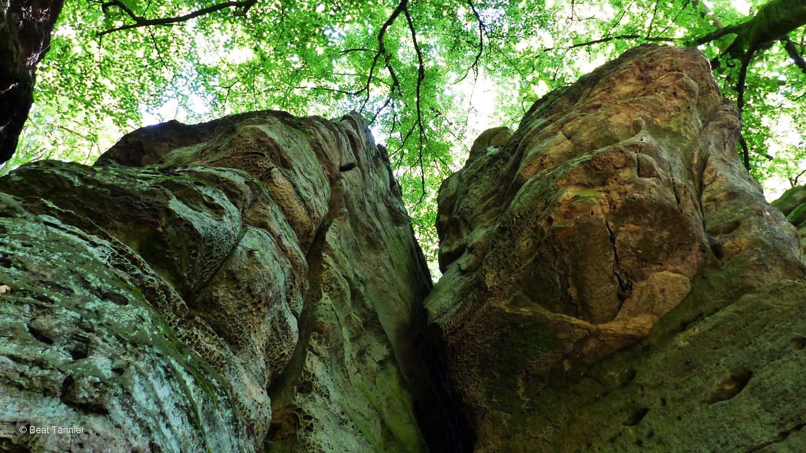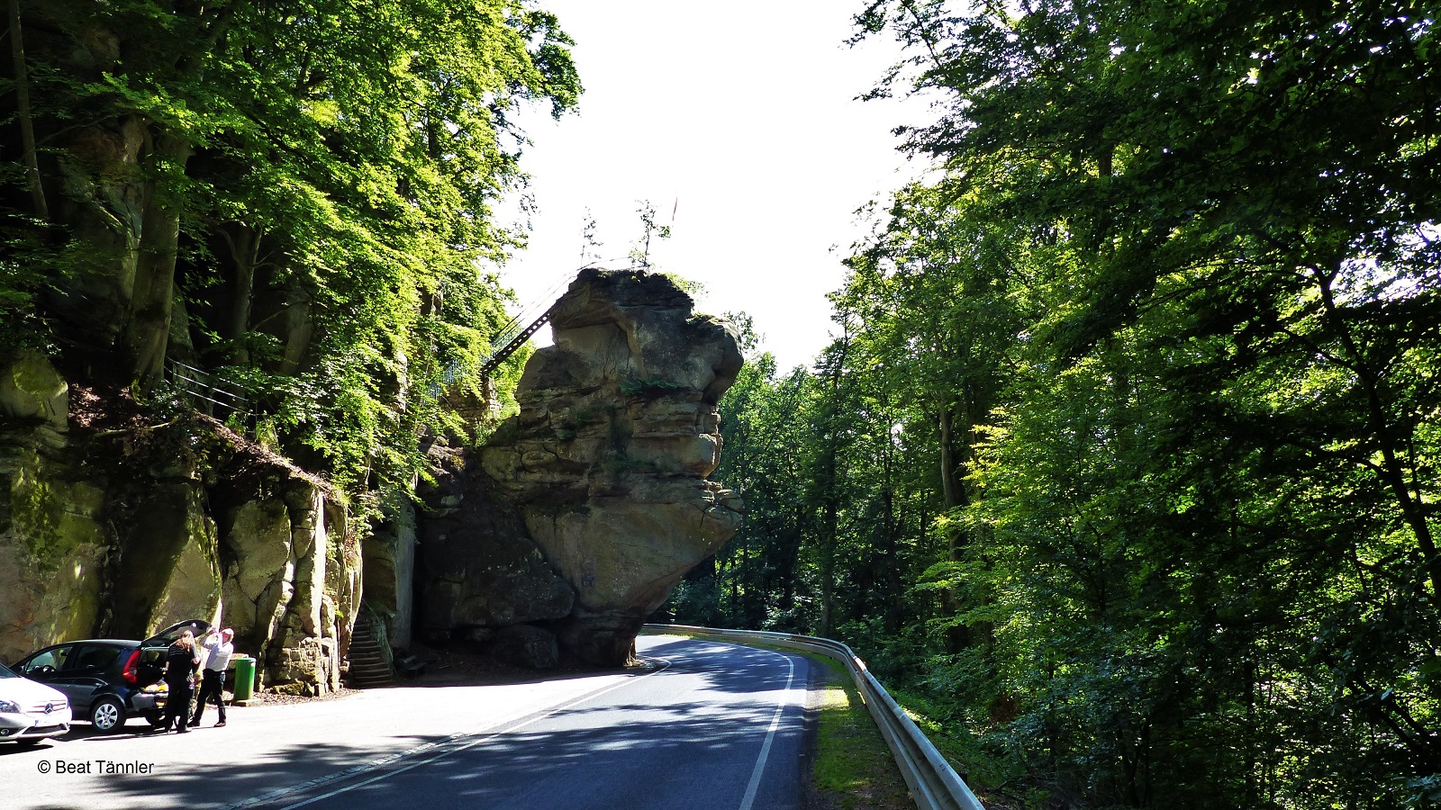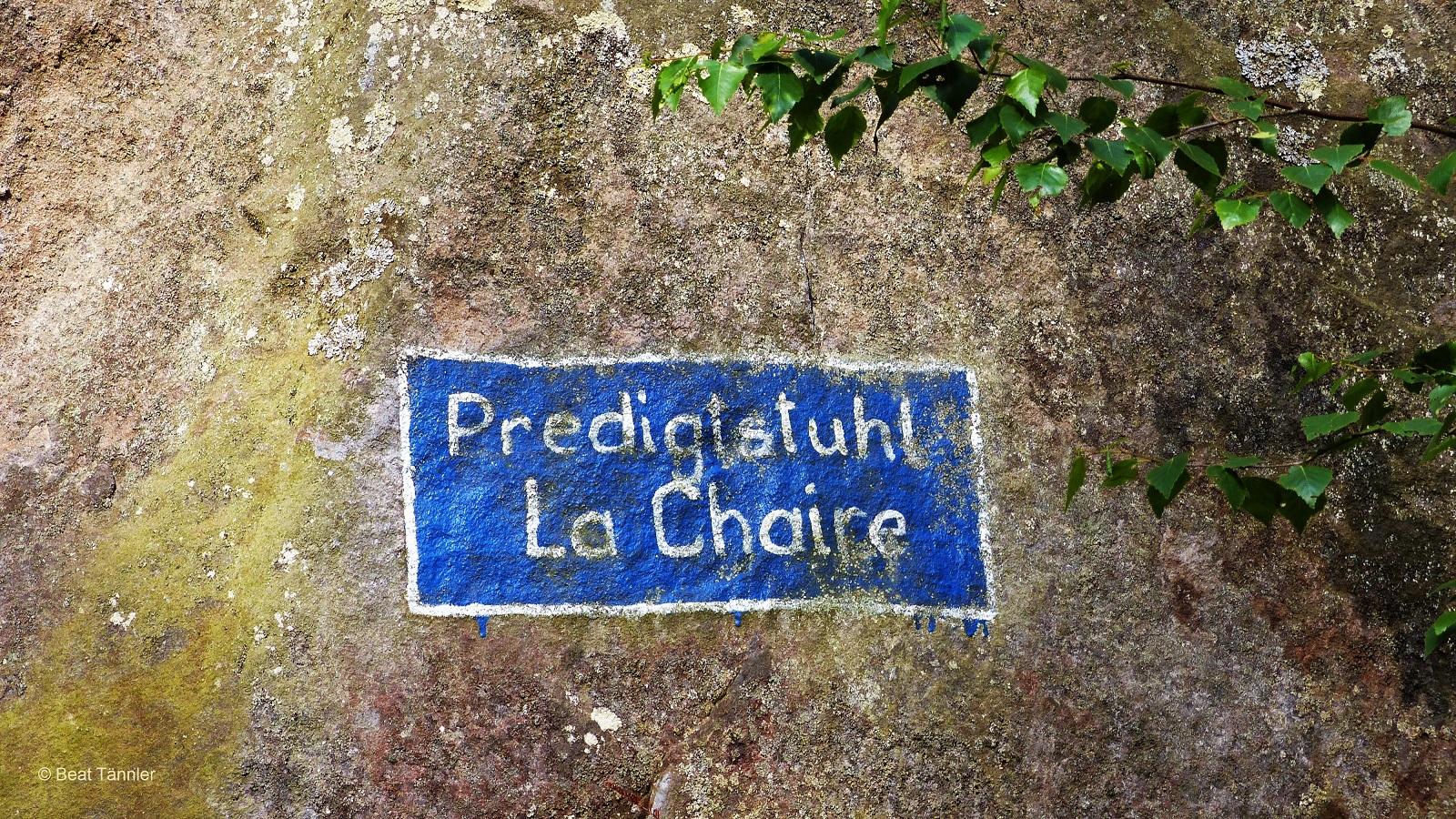 Wir finden stattdessen einen eindrücklichen „Predigtstuhl“. Nicht ganz so imposant wie der berühmte Preikestolen am Lysefjord in Norwegen, aber immerhin … ein Predigerstuhl ist ein Predigerstuhl … und man kann ihn ebenfalls besteigen.