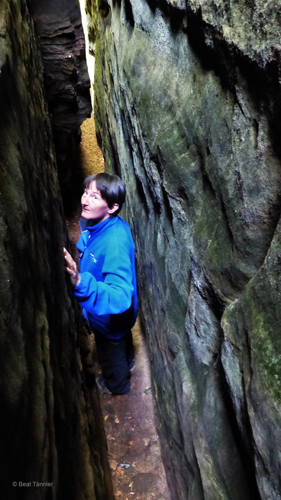 Danach spazieren wir auf den Wegen zwischen den mächtigen Sandsteinfelsen. Einige Passagen sind so schmal, dass man sie nur seitwärts gehend passieren kann.