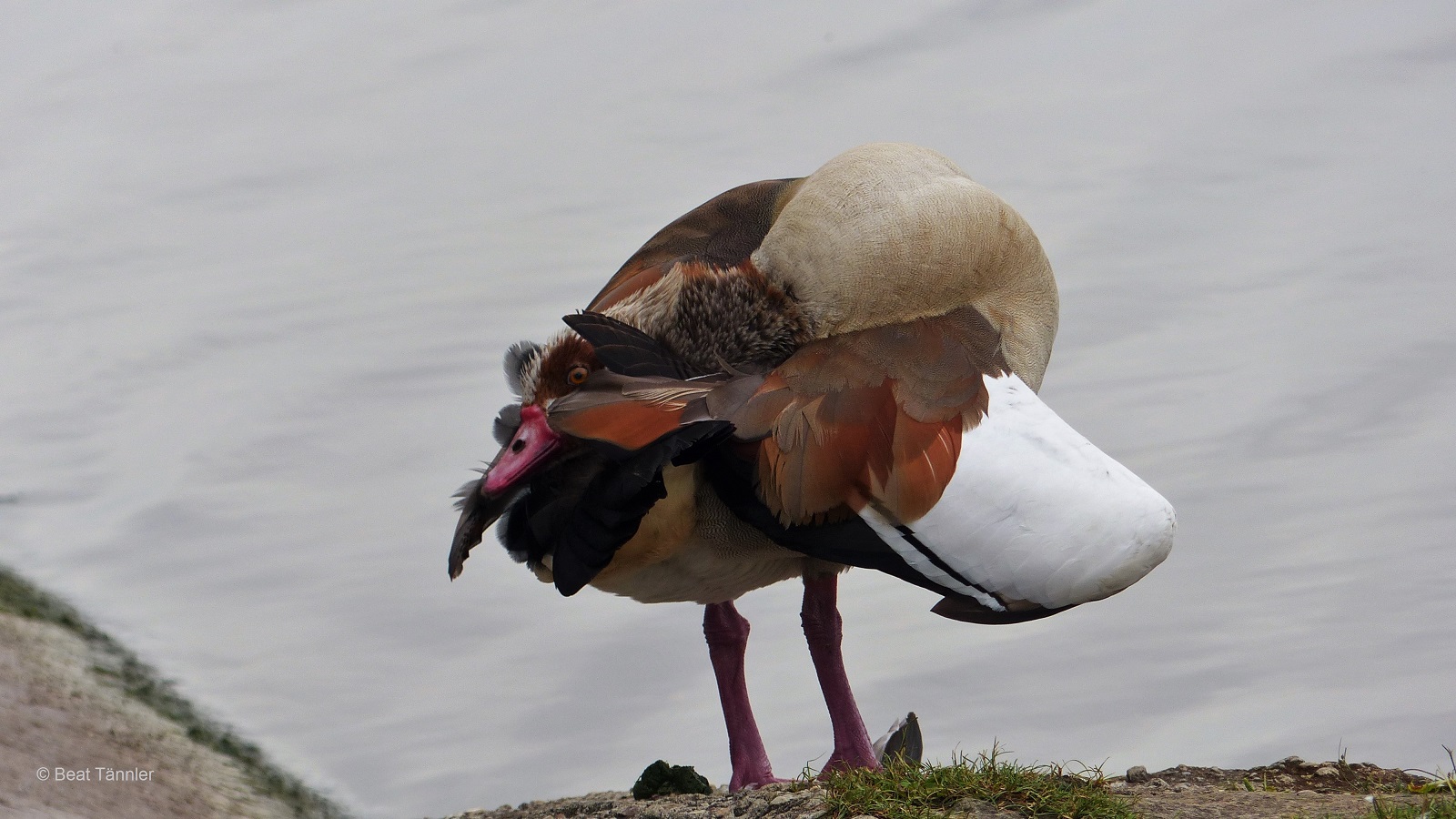 Am Morgen sehen wir, dass auch Schwäne und Nilgänse hier übernachtet haben. Morgentoilette ist angesagt und nötigt die Vögel zu einigen Verrenkungen und Beat zu nicht alltäglichen Bildern.