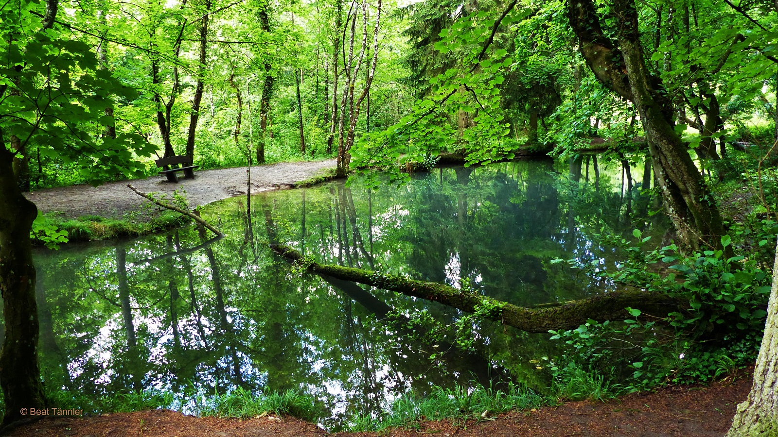 An einem idyllischen Teich im Wald steht eine offene Hütte, in der man bei Regen Schutz suchen kann. Wanderer, was willst du mehr?