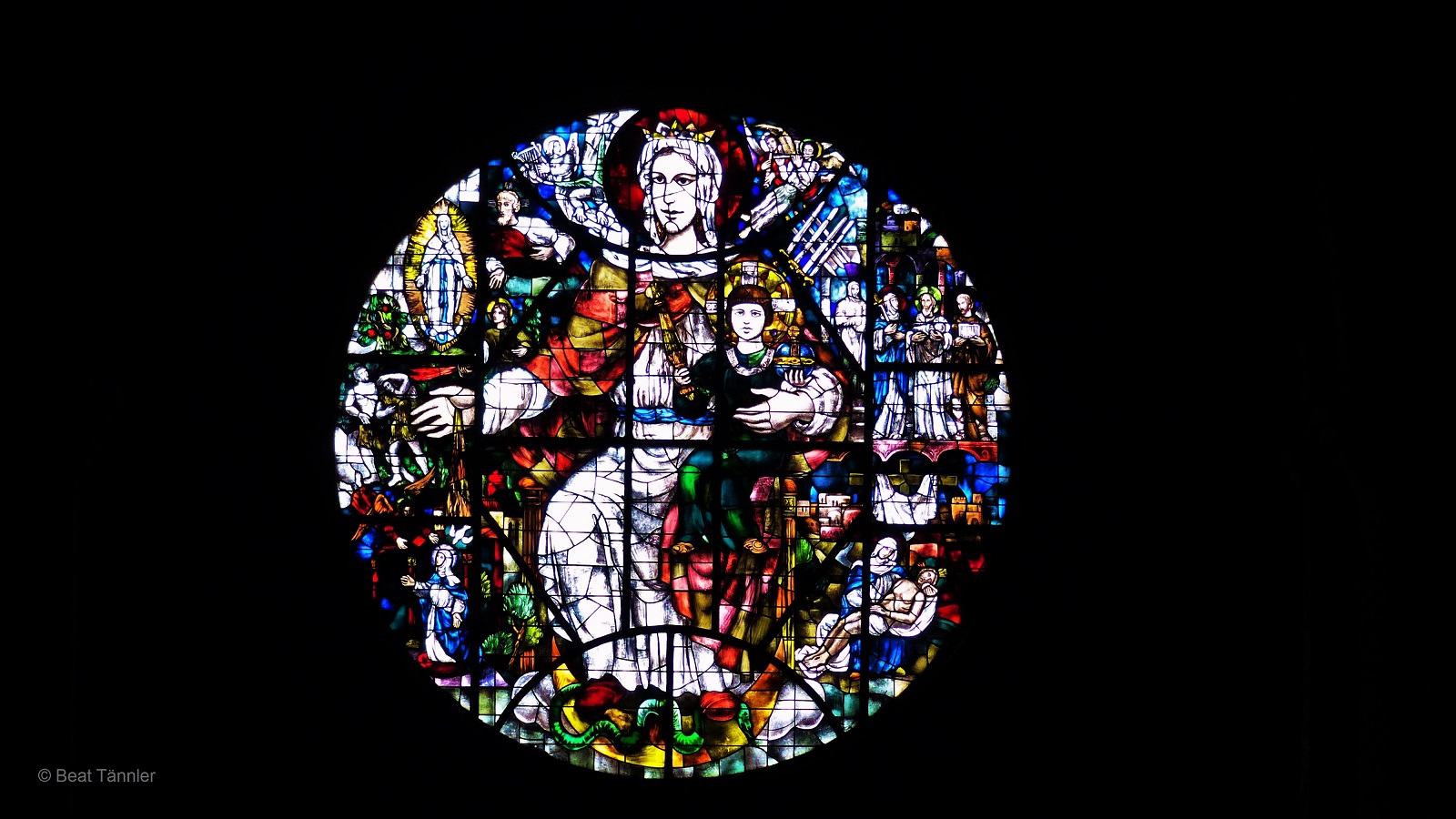 Von hier hat man freien Blick auf das wunderschöne Glasbild im Chor.