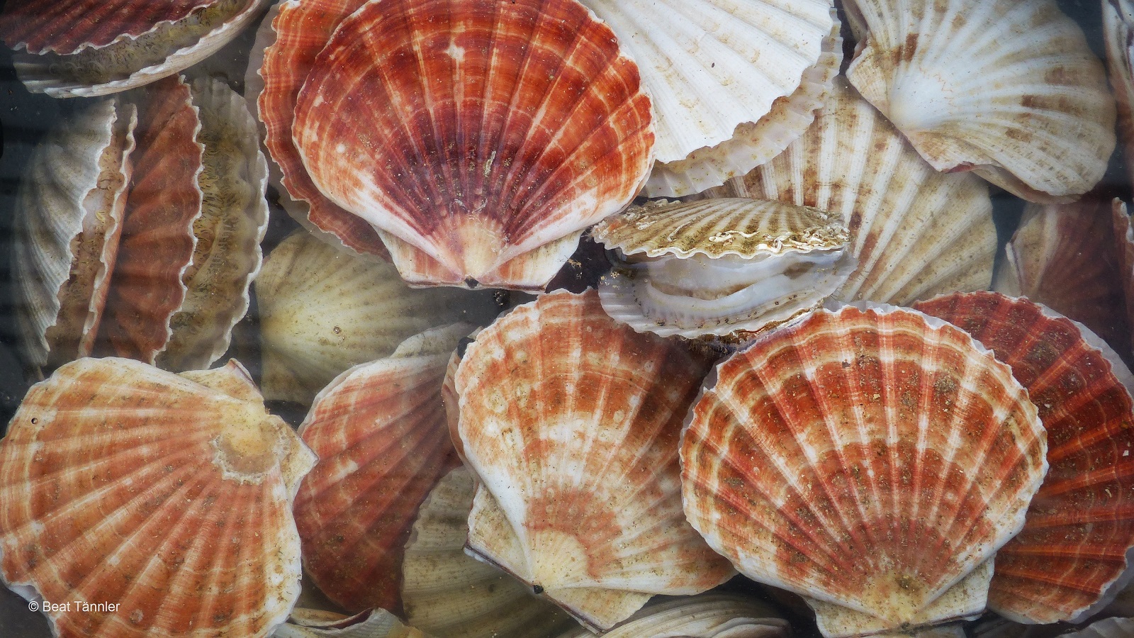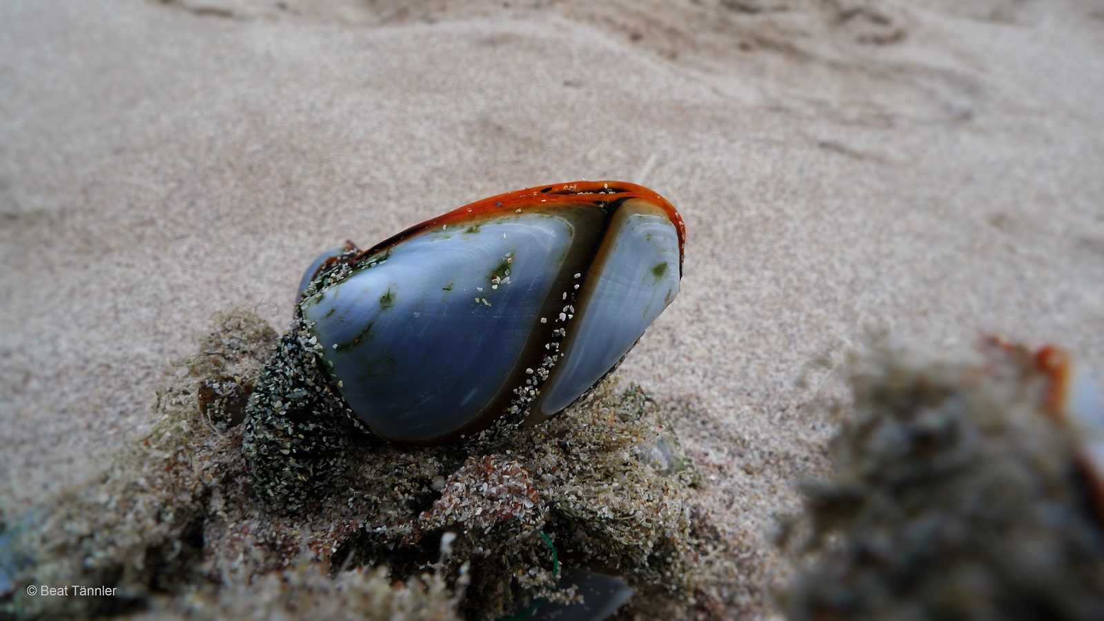 Wir sammeln einmal mehr herumliegende Abfälle ein. Ein Strandgut lassen wir jedoch liegen. Eine losgerissene gelbe Boje. An deren blauem Tau hängen einige sehr dekorative Muscheln, die wir noch nie gesehen haben. Vielleicht erfreuen sich ja noch andere an diesem Bijou?