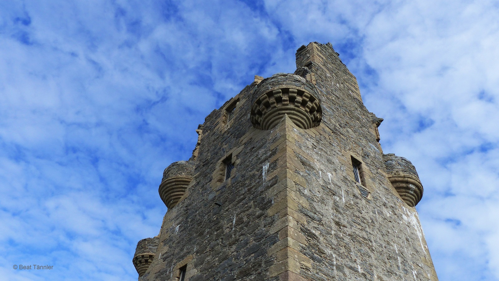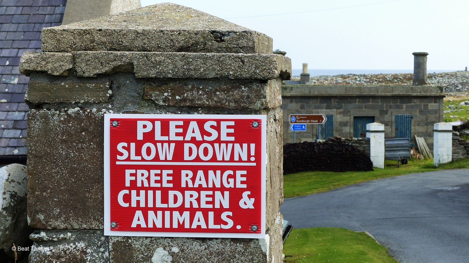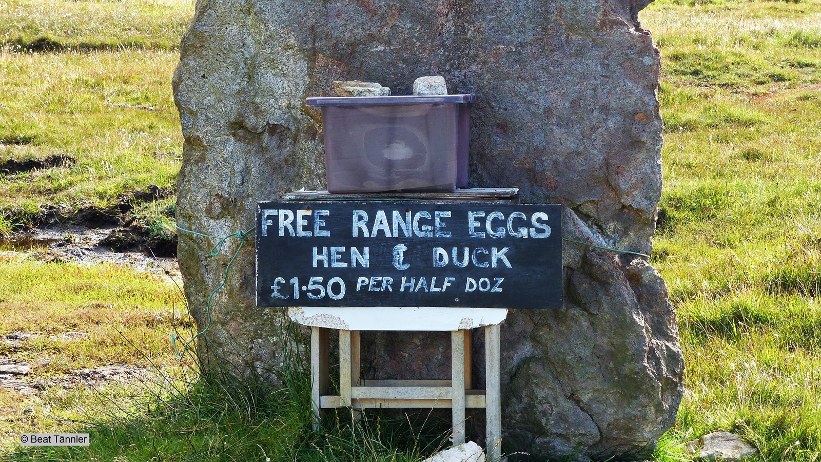 Kurz nach Drumberg müssen wir auf einen „Passing Place“ ausweichen, um ein Auto passieren zu lassen. Der weisshaarige Fahrer hält neben uns an, kurbelt das Fenster hinunter und fragt: „Aus welchem Land kommt ihr? Ich kenne euer Nummernschild nicht“.