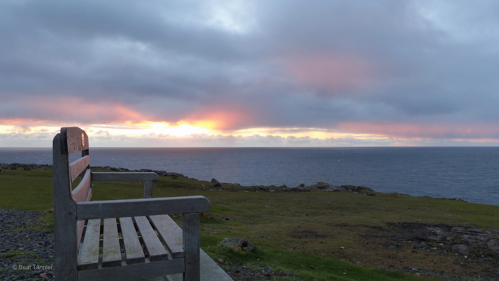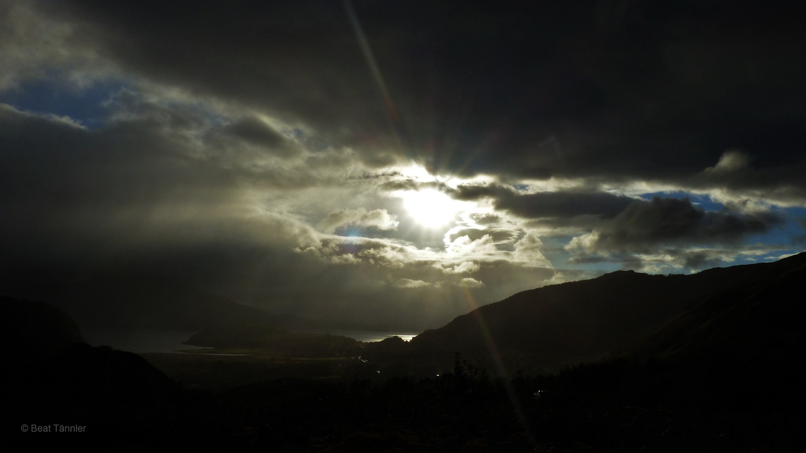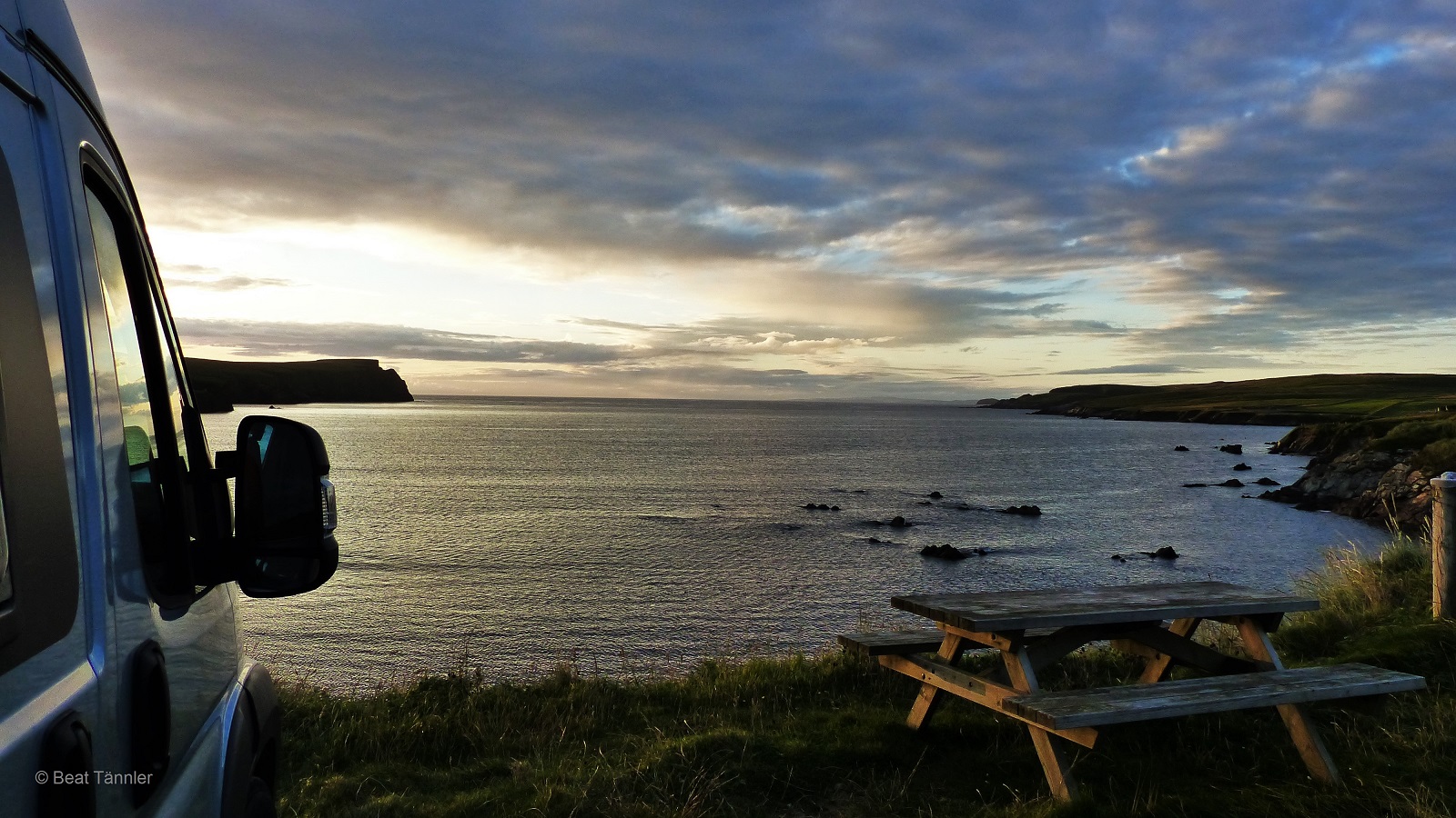 Etwas oberhalb von Auchtertyre bleiben wir auf einem Parkplatz. Hier sind wir etwas windgeschützt und die Temperaturen liegen merklich höher als auf dem Pass. Plötzlich reisst die Wolkendeke etwas auf und die Sonne wünscht uns eine gute Nacht.