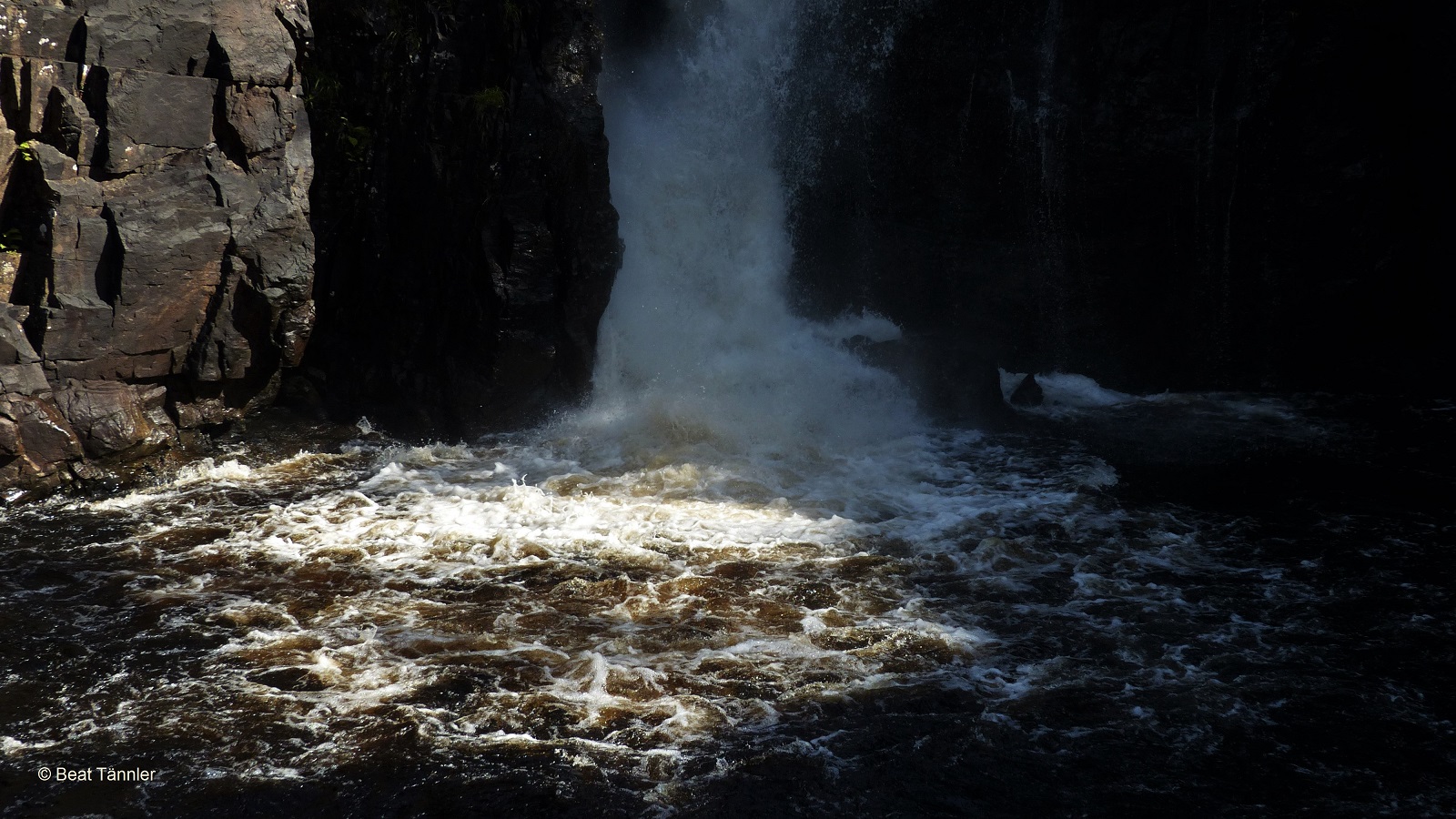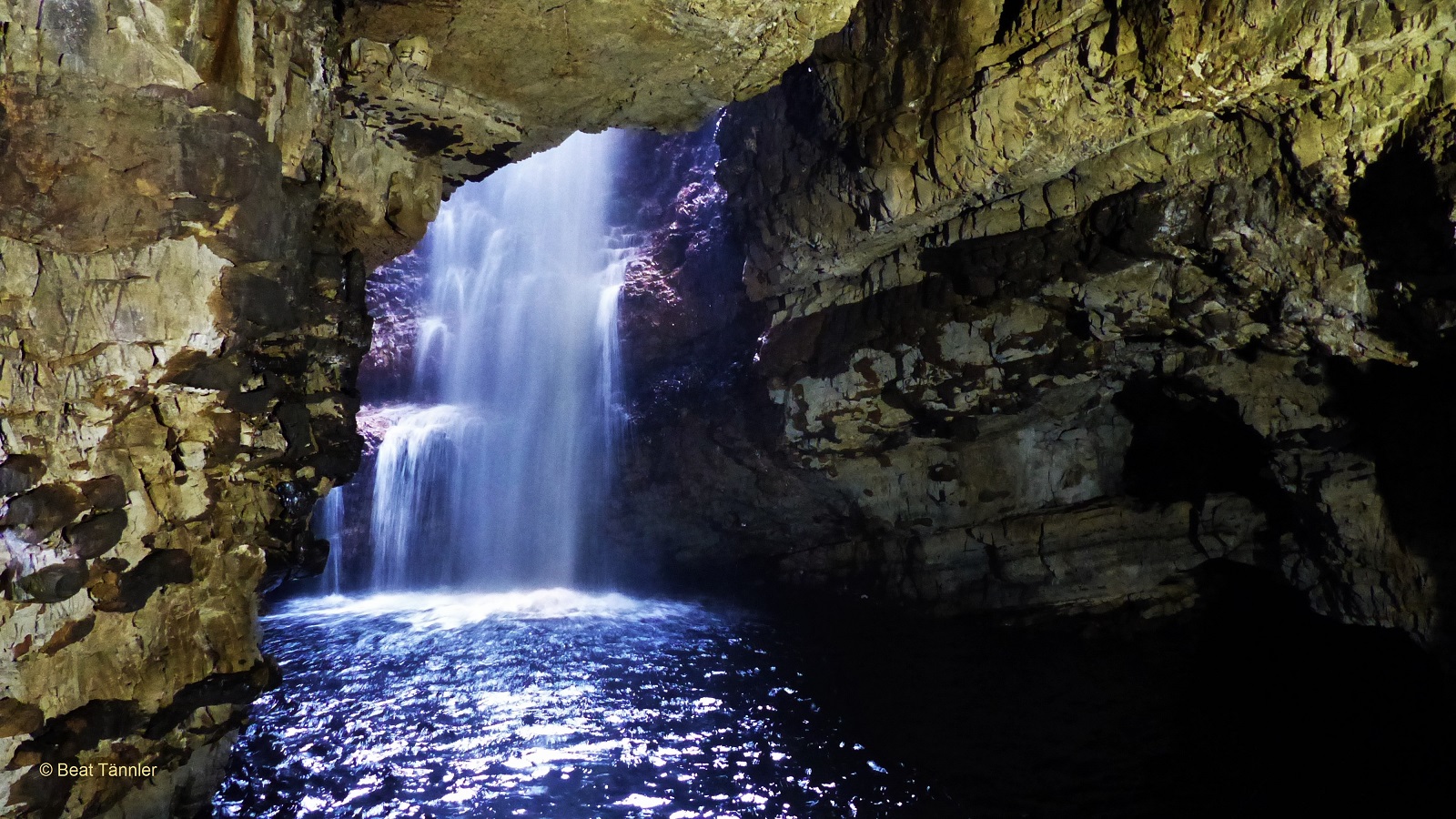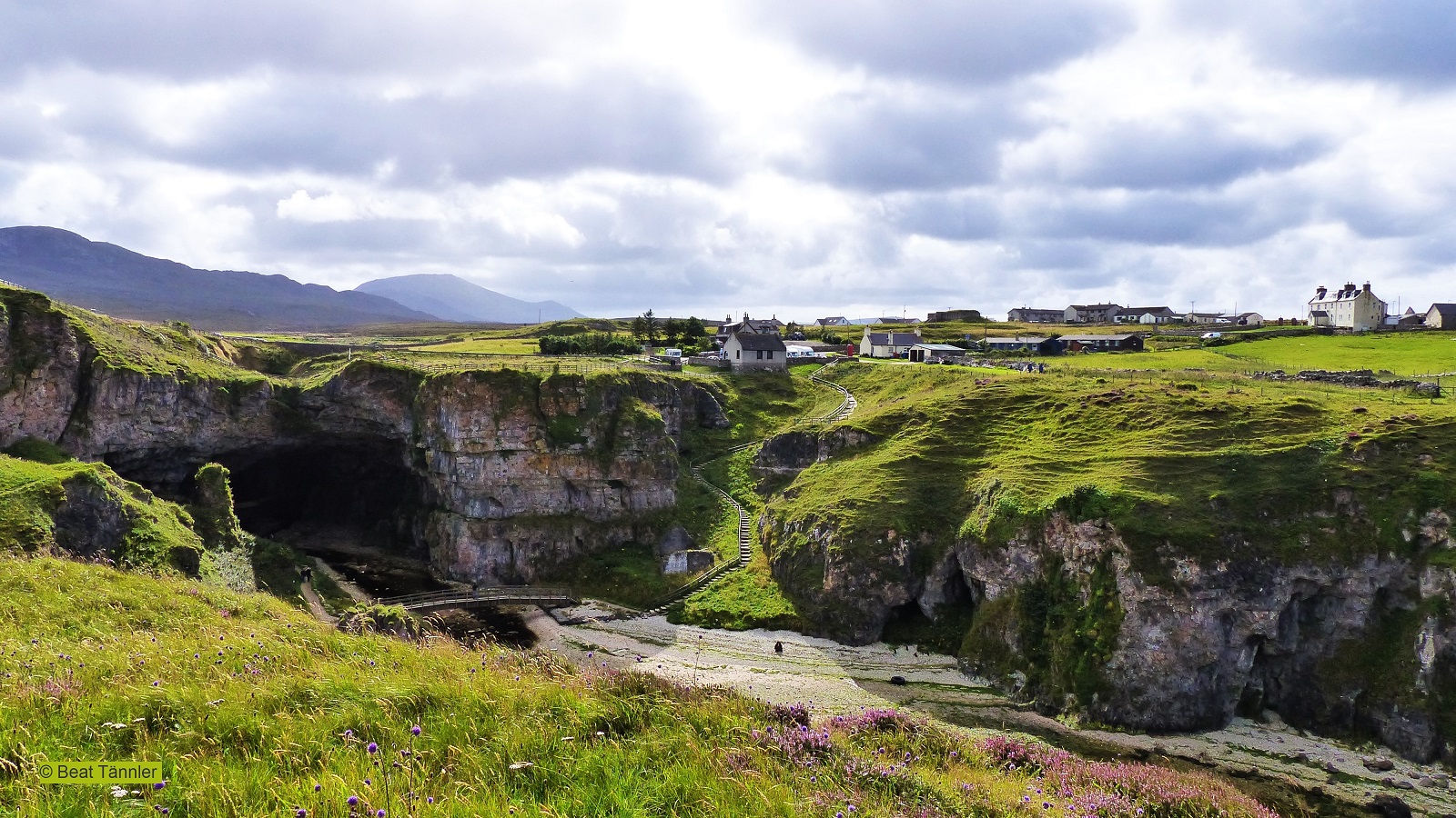Einige Meilen weiter besichtigen wir die Smoo Cave. Die Höhle entstand ursprünglich durch die Brandung des Meeres und wurde dann durch einen Bach, der sich in den Fels frass, weiter ausgehöhlt. Der Wasser stürzt heute durch ein Loch in die Höhle. Das Rauschen und das Licht, das bei der Kaskade einfällt, verleihen der Grotte eine eigenartige, fast geheimnisvolle Stimmung.