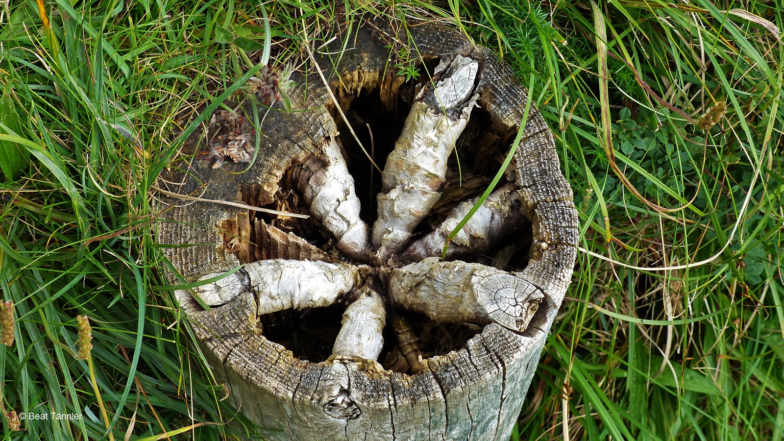 Beim Spaziergang zurück entdecken wir einen dekorativen Holzpfosten. Durch die Witterung ist das weichere Holz verfault. Dadurch wurden die kreisförmig angelegten Aststummel dieser ehemaligen Fichte freigelegt. Auf dem Bild sieht man schön, dass diese Äste strahlenförmig auf derselben Höhe aus dem Kern herauswachsen.