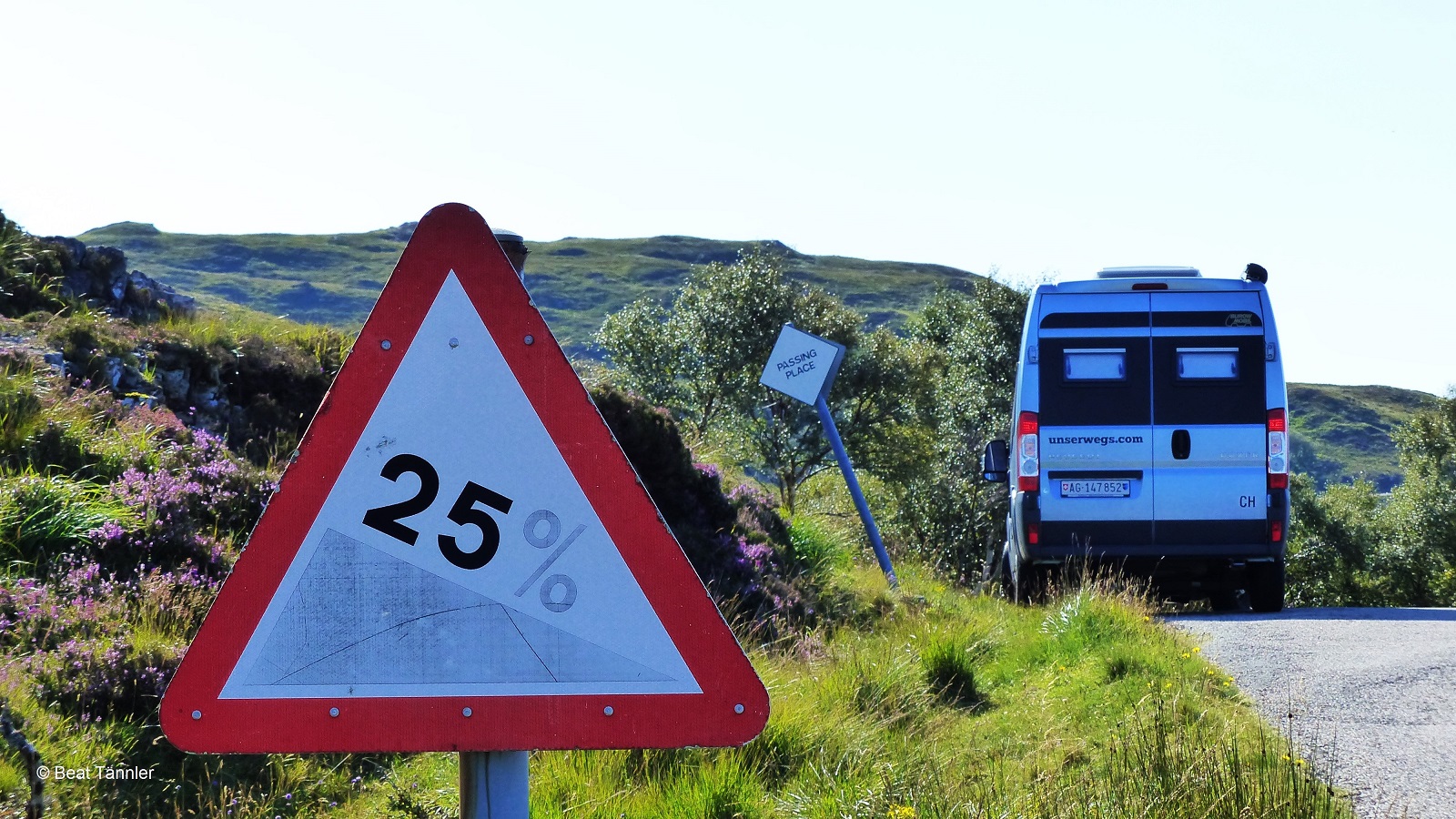 Die schmale Strasse führt ungewohnt steil durch das schottische Hochland. Die 25 % Gefälle hat unser NOBIS wohl zuletzt im Hinterland Albaniens bewältigen müssen. Dort war zudem der Weg unbefestigt.
