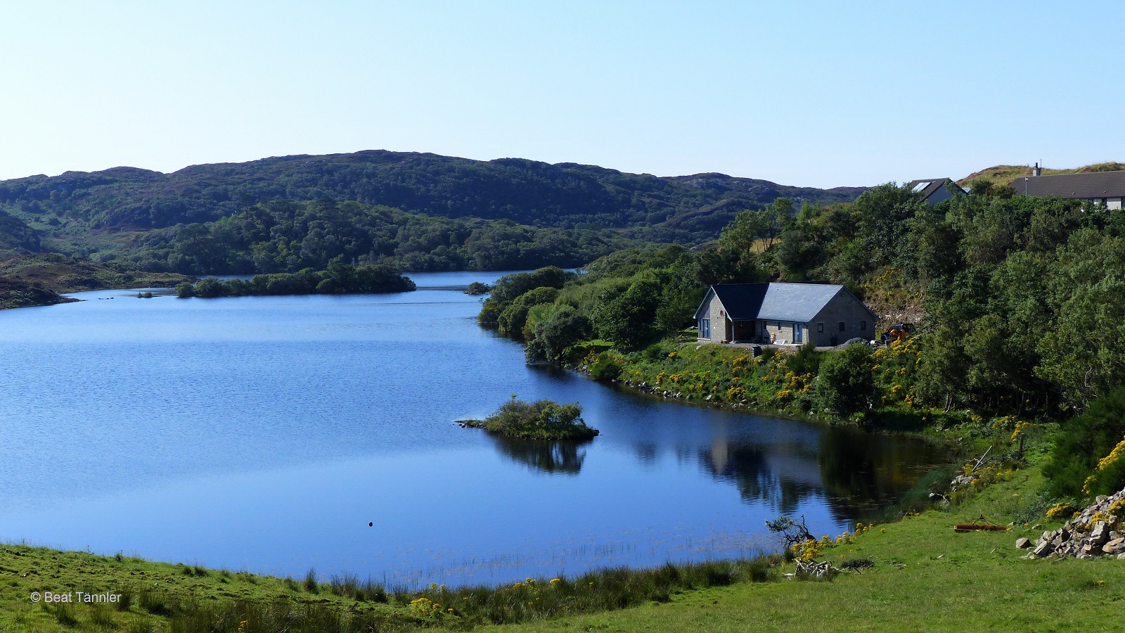 In Lairg entdecken wir eine kleine Insel, auf die jemand ein Häuschen gebaut hat. Sogar an das Windrad für die Energieversorgung wurde gedacht. Ob da wohl Zwerge wohnen?