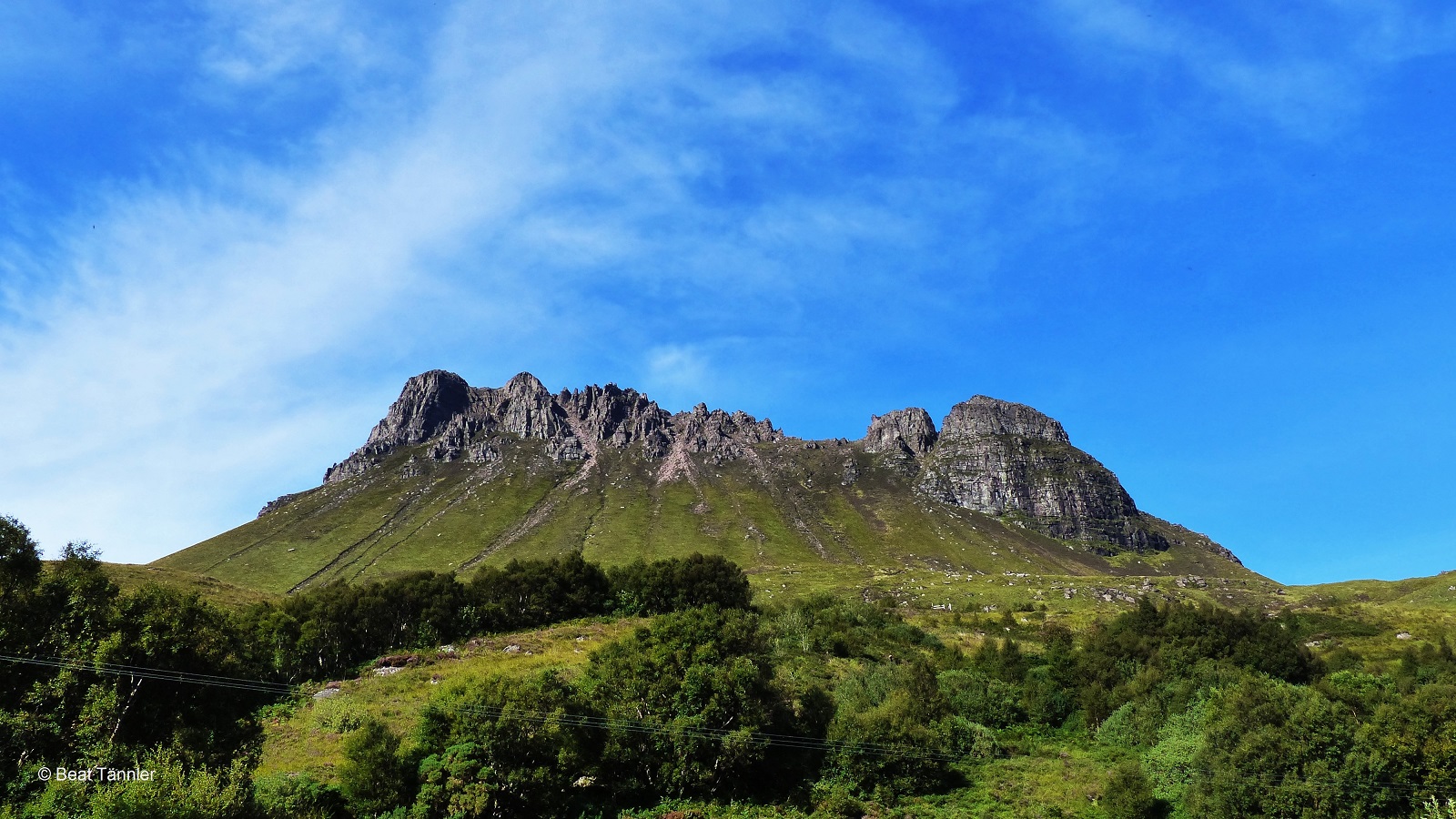 Dann geht es weiter zum Parkplatz am Loch Lurgainn unterhalb des Stac Pollaidh. Wir blicken hoch zu diesem Berg, den wir morgen umrunden wollen.
