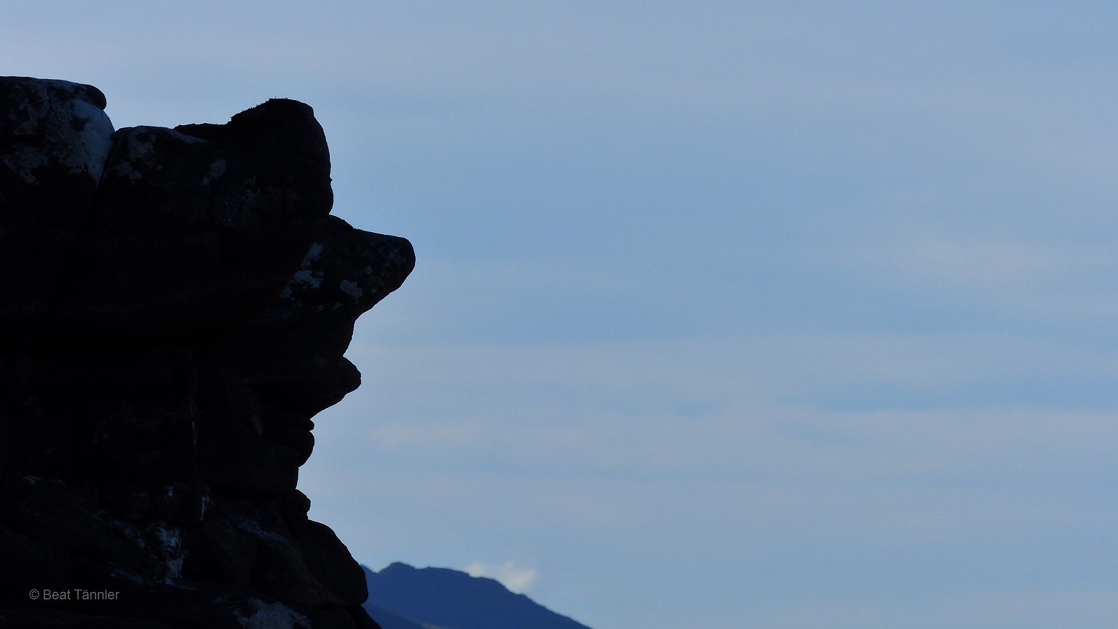 Vor langer langer Zeit ist jemand hier hoch gestiegen und so lange stehen geblieben, bis er versteinerte. Wenn man genau hinguckt, sieht man sogar zwei Gesichter im Profil.