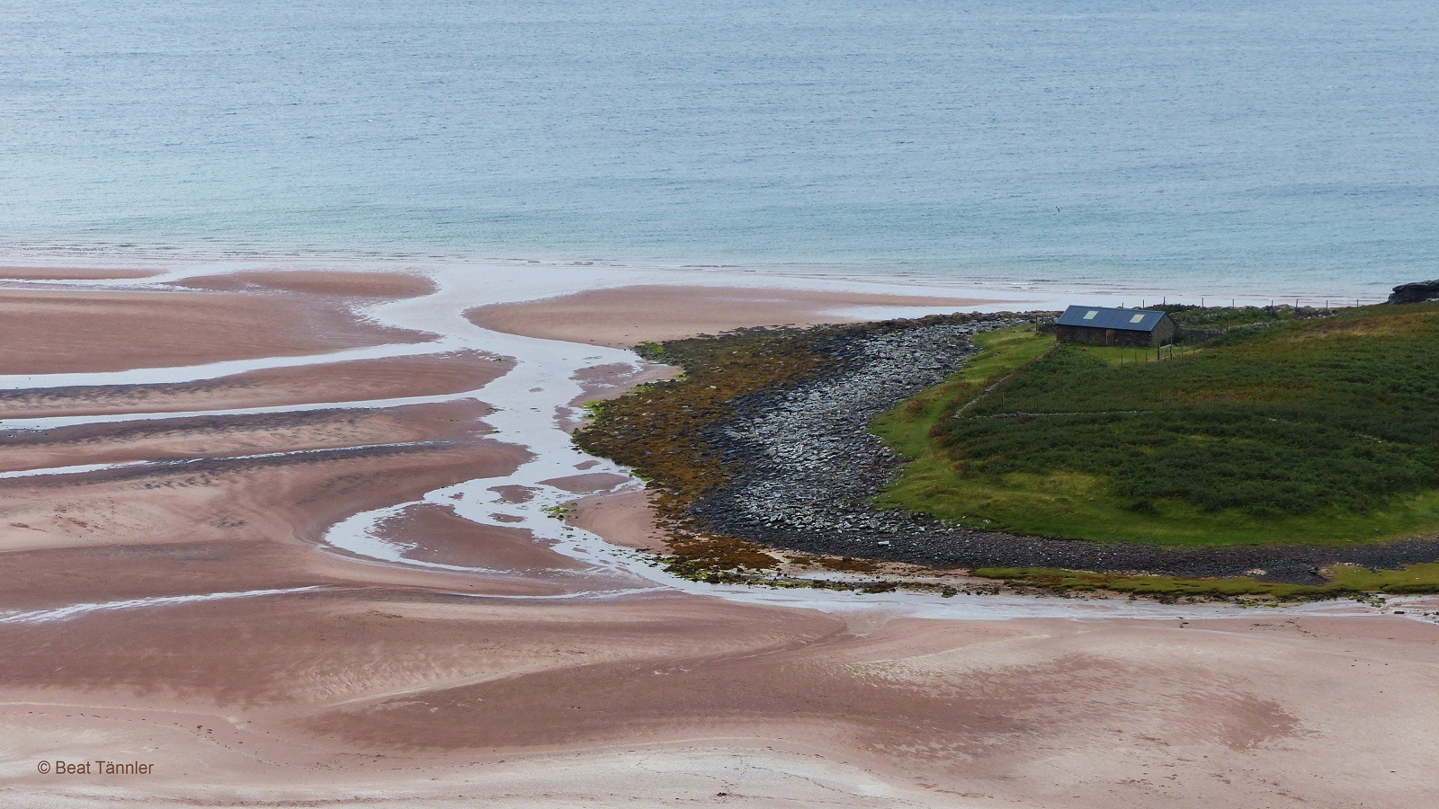 Der Strand von Durness wird auf der einen Seite von roten Felsen begrenzt. Man sieht an ihm sehr schön, wie die Schichtung vertikal verläuft, die Sedimente also einst durch Faltung aufgestellt wurde. Auch der Sand hat hier eine leicht rötliche Farbe.