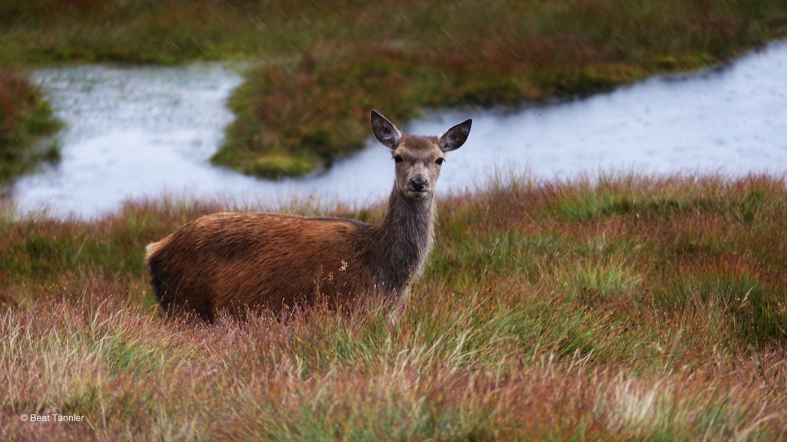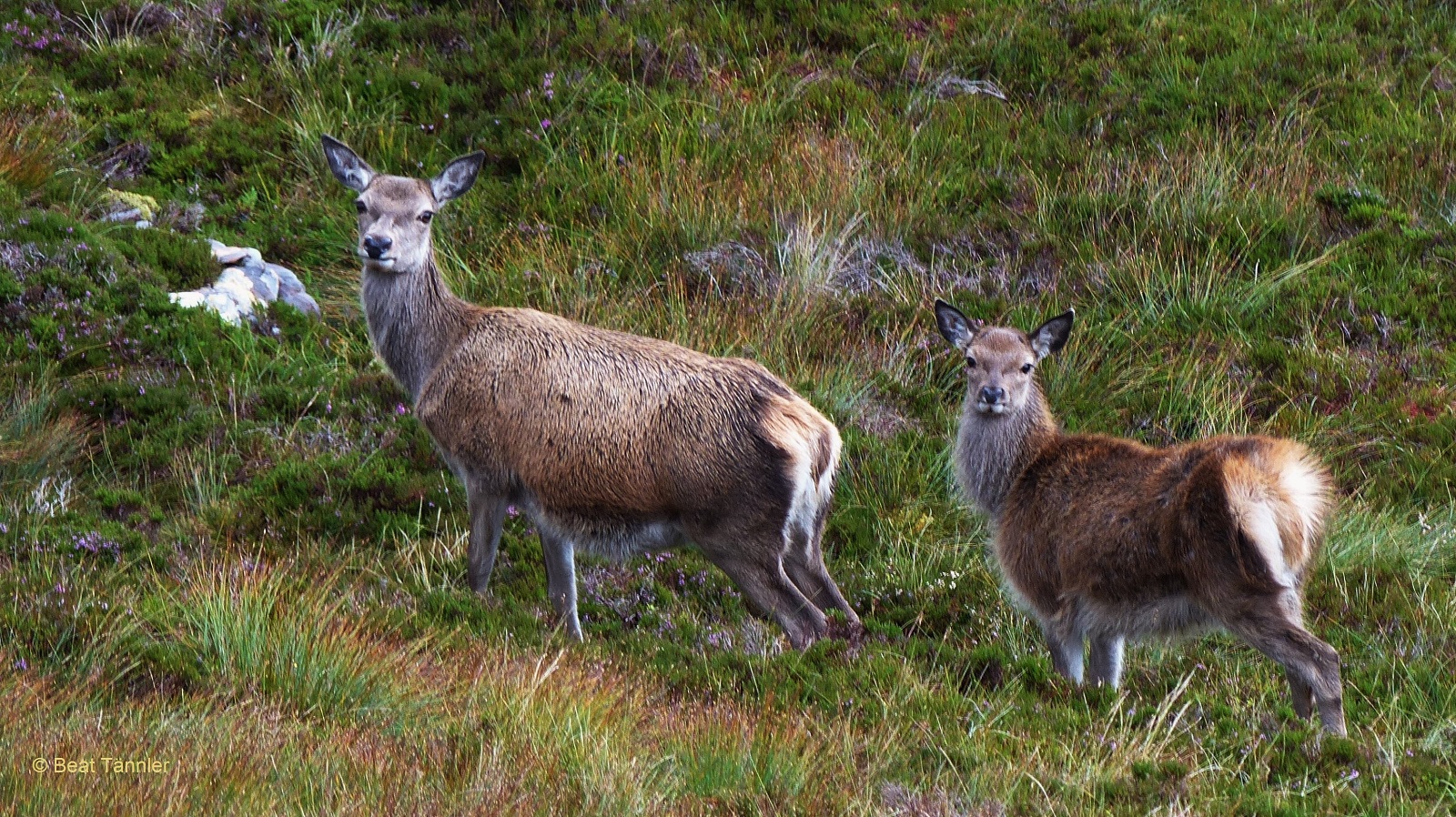Eine Hirschkuh mit ihrem Kalb. Sie sind nicht sehr scheu, schauen aber immer wieder prüfend, ob wir ihnen nicht etwa zu nahe treten. Irgendwann entscheiden sie sich, hinter dem nächsen Hügel zu äsen. Ruhig ziehen sie weiter.