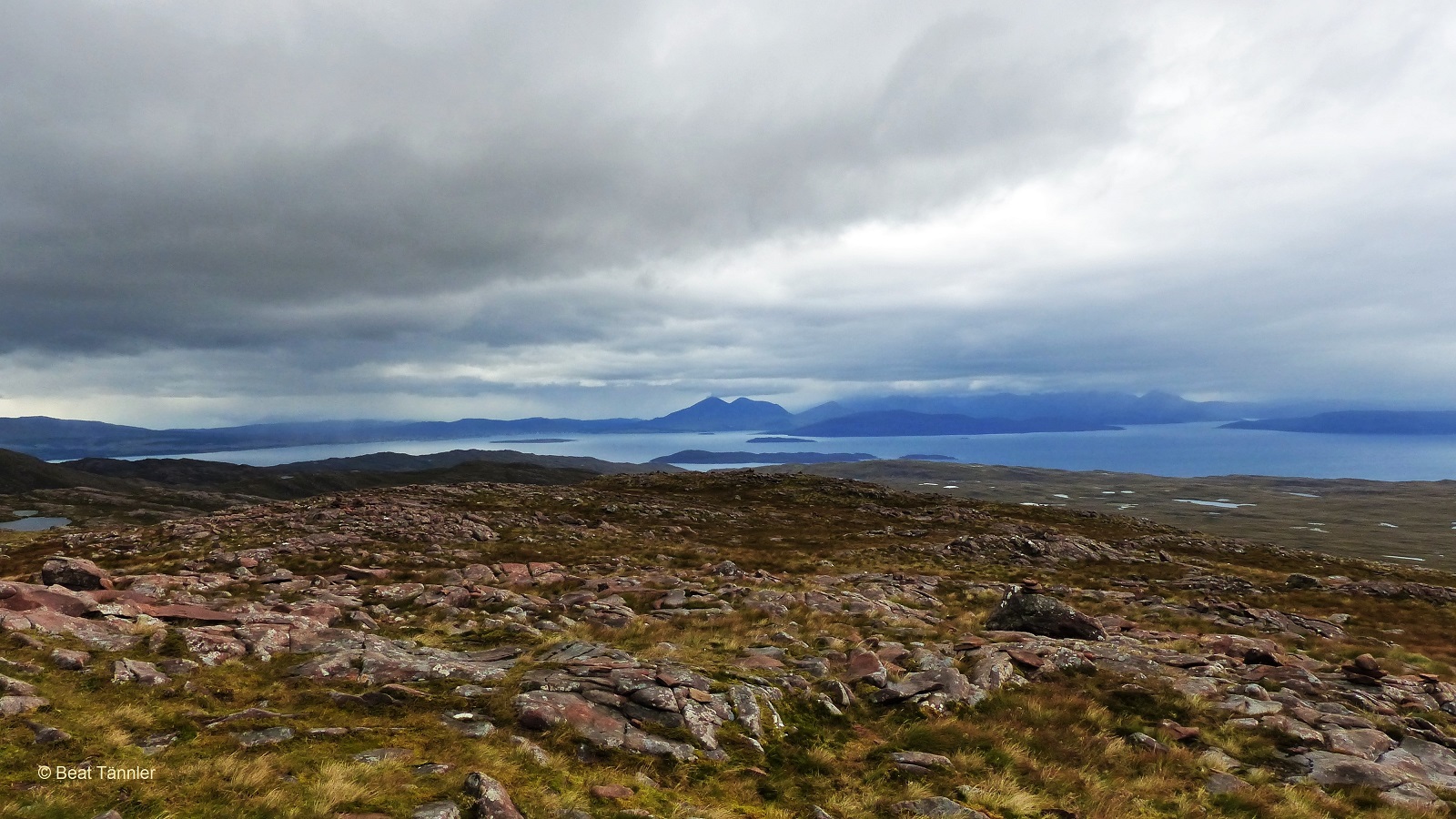 Wir brechen um neun Uhr auf zur Rundwanderung um den Stac Pollaidh. Wir steigen hoch zum Grat des Berges und geniessen die Aussicht. Der schroffe Gipfel und die umliegenden Hügel und Seen zeigen sich im schönsten Licht. Zum ersten Mal seit langem treffen wir auf einen vorbildlich angelegten Wanderweg, sogar das Wasser wird mustergültig abgeleitet.