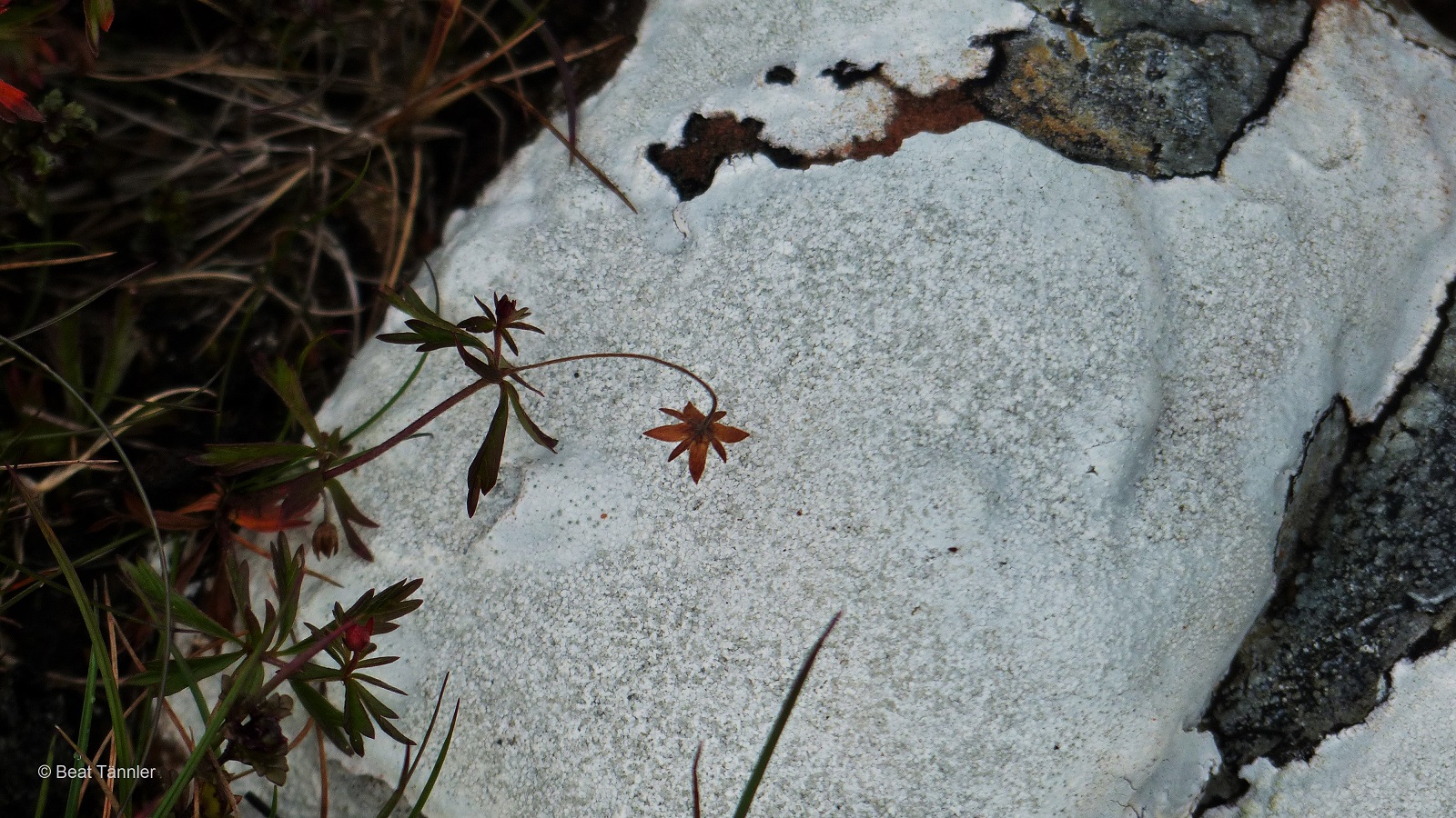 Auch am Boden gibt es einige Trouvaillen zu entdecken. Ein Felsstück im Gras zum Beispiel ist zum grössten Teil mit weissen Flechten überwachsen.