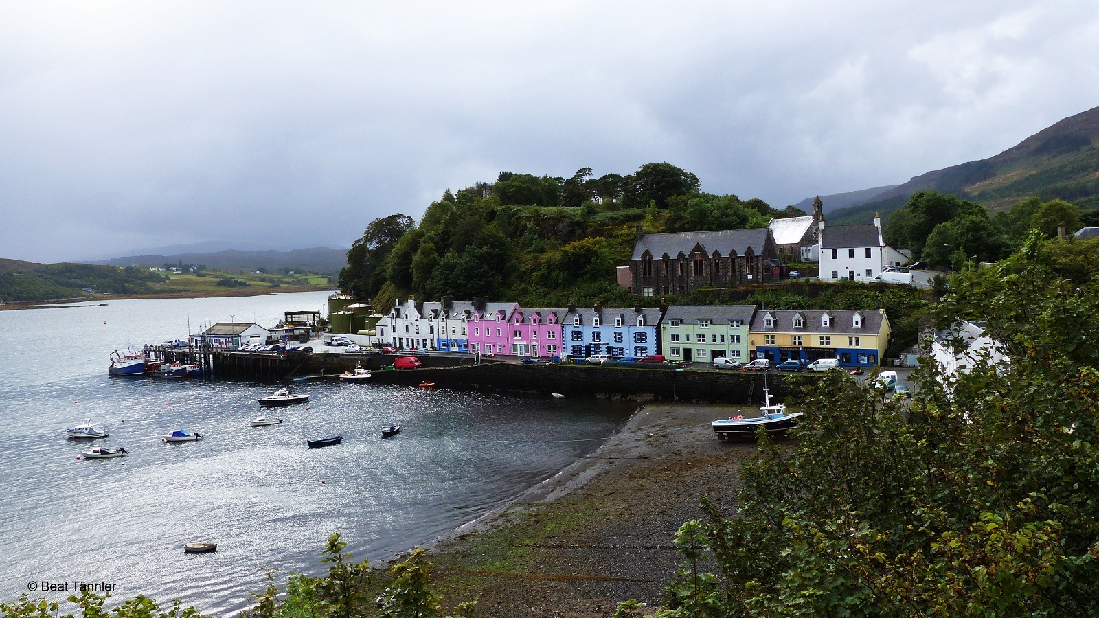 Wir fahren auf die Isle of Skye, die zu den Inneren Hebryden zählt, und spazieren durch Portree. Am Pier sind die Häuser bunt gestrichen. Dadurch wirkt der schlichte Hafen malerisch.
