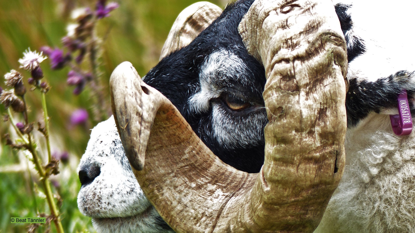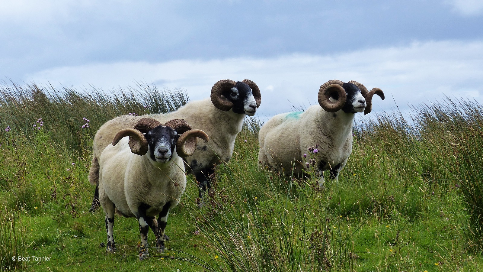 Auf der Weiterfahrt nach Staffin entdecken wir einmal mehr besondere Schafe. Man verzeihe uns, dass wir schon wieder Fotos dieser Wolltiere zeigen. Aber erstens sind Schafe in Schottland allgegenwärtig und zweitens finden wir diese drei Böcke mit ihren imposanten, gerollten Hörnern einfach sehenswert.