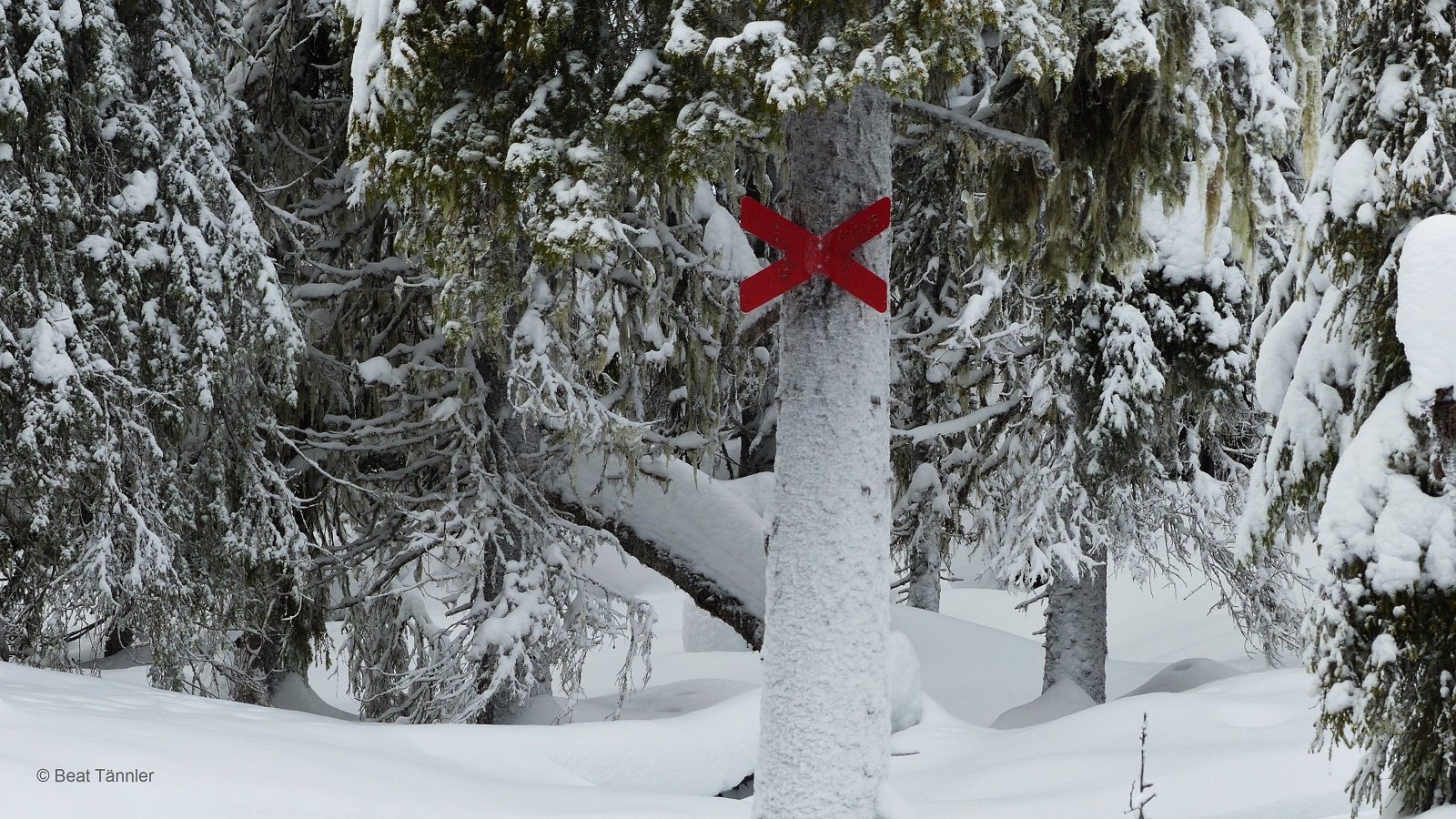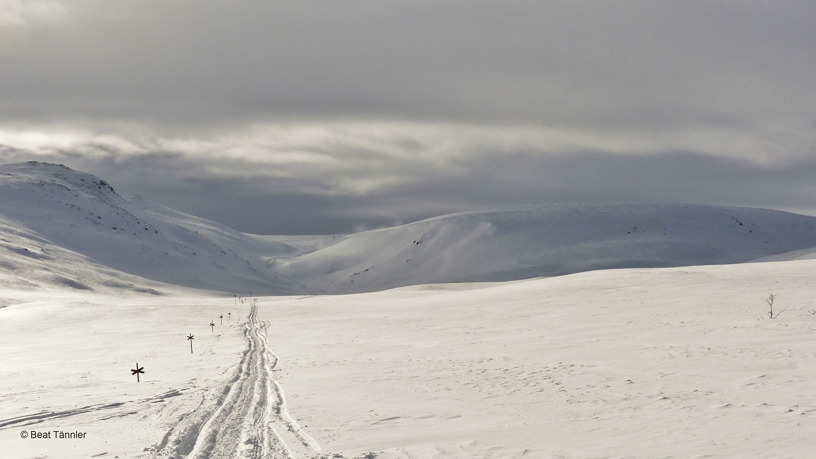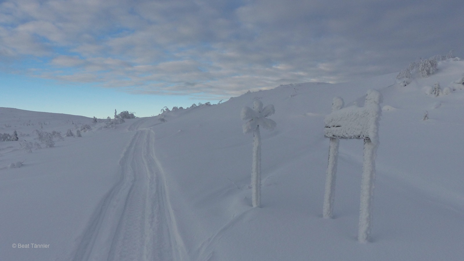 Das Wetter ist wie gestern neblig-trüb. Die fehlende Sonne lässt die Winterlandschaft schwarz, grau, weiss erscheinen und lediglich die roten Wegkreuze bringen etwas Farbe ins Bild. Man wähnt sich alleine und am Ende der Welt.