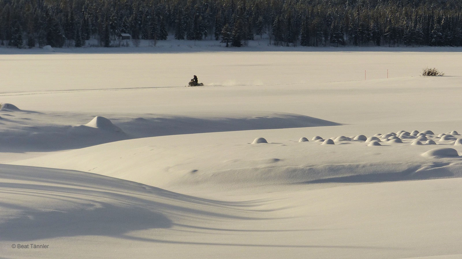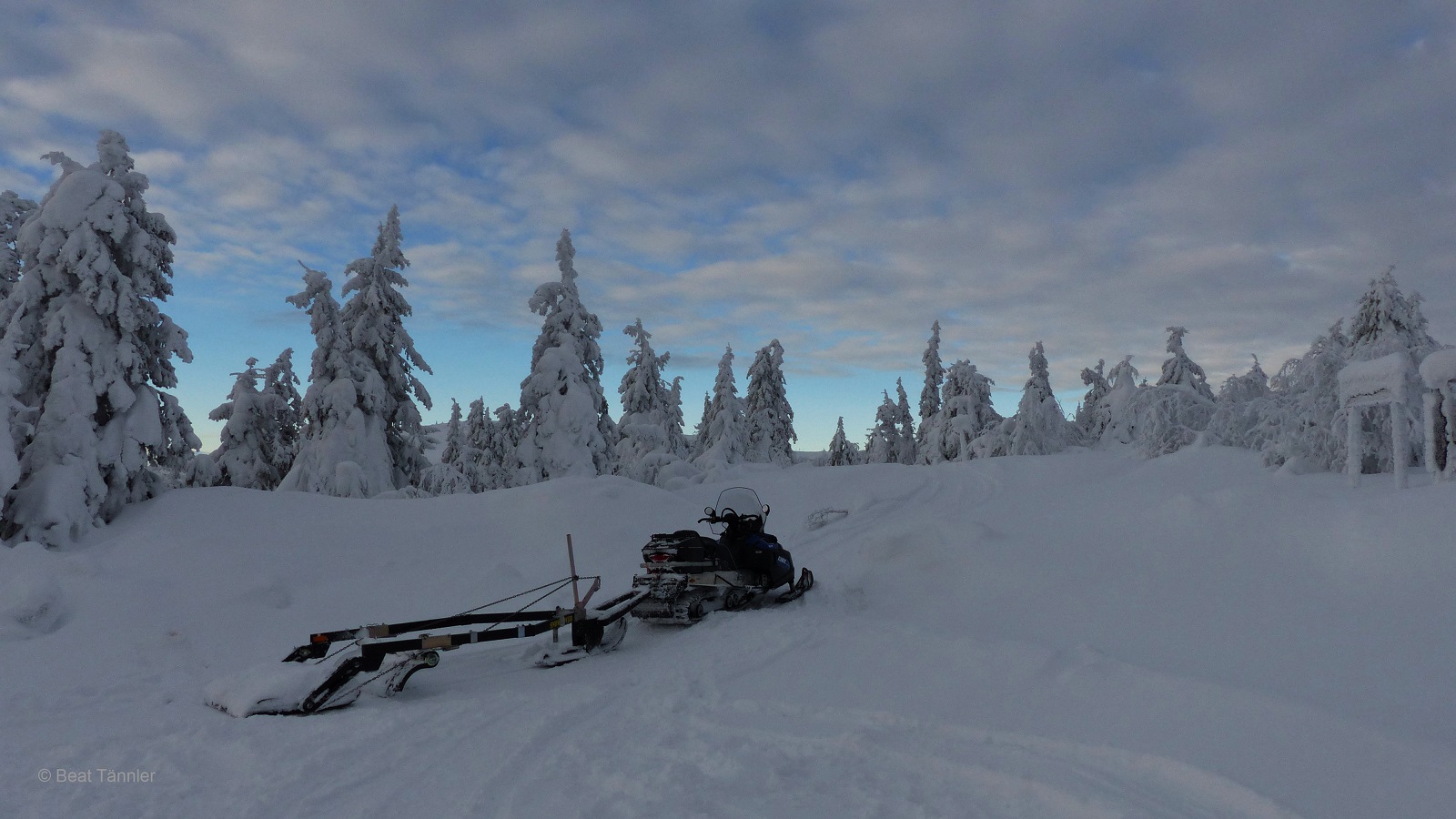 Matthias, die Gäste und Annette fahren mit den Schlitten voraus. Beat lädt das Gepäck und die Stake-Outs in die Pulka und folgt ihnen mit dem Schneemobil.