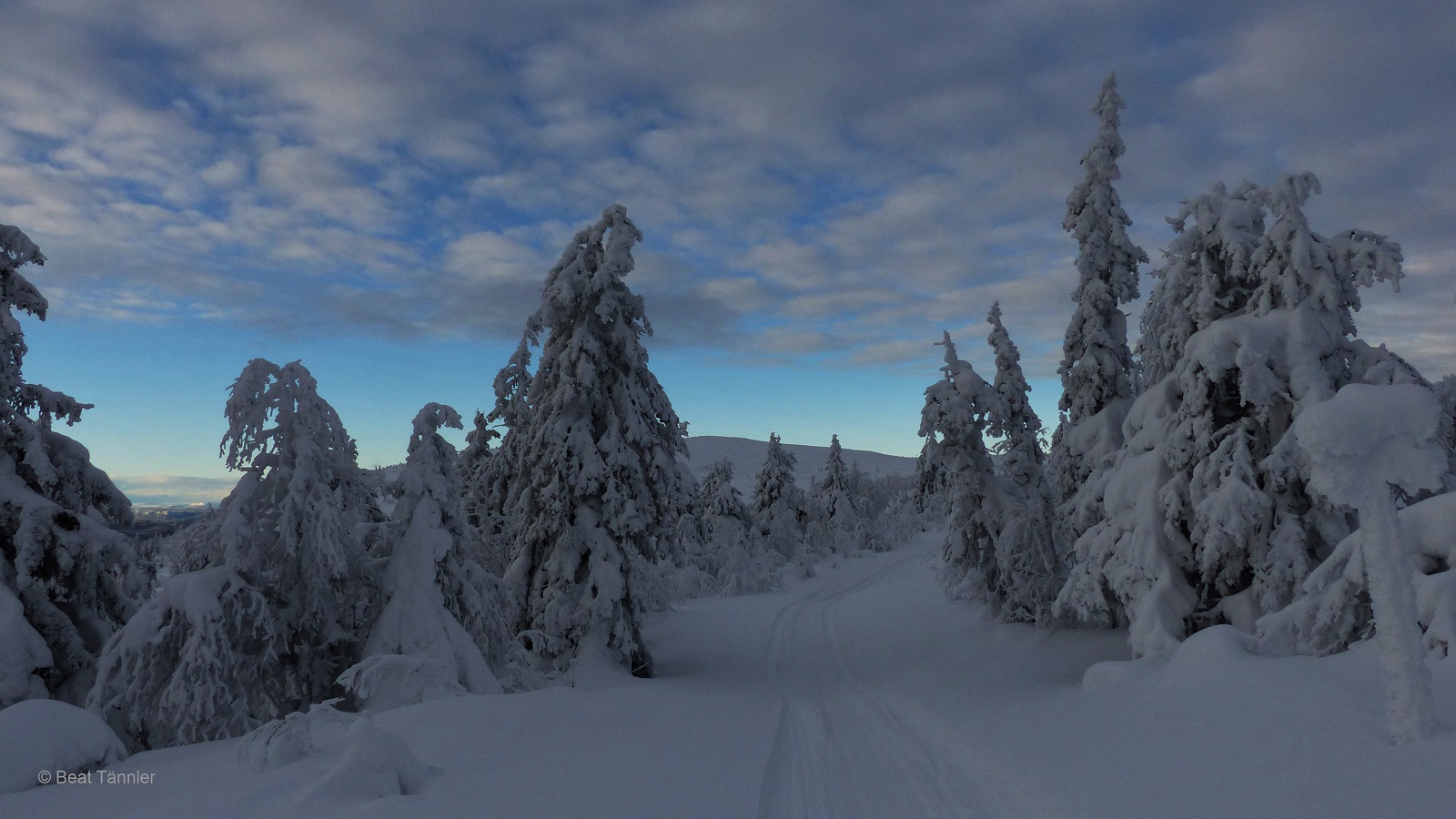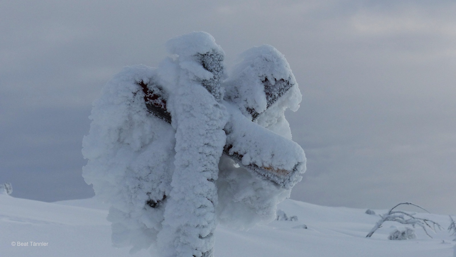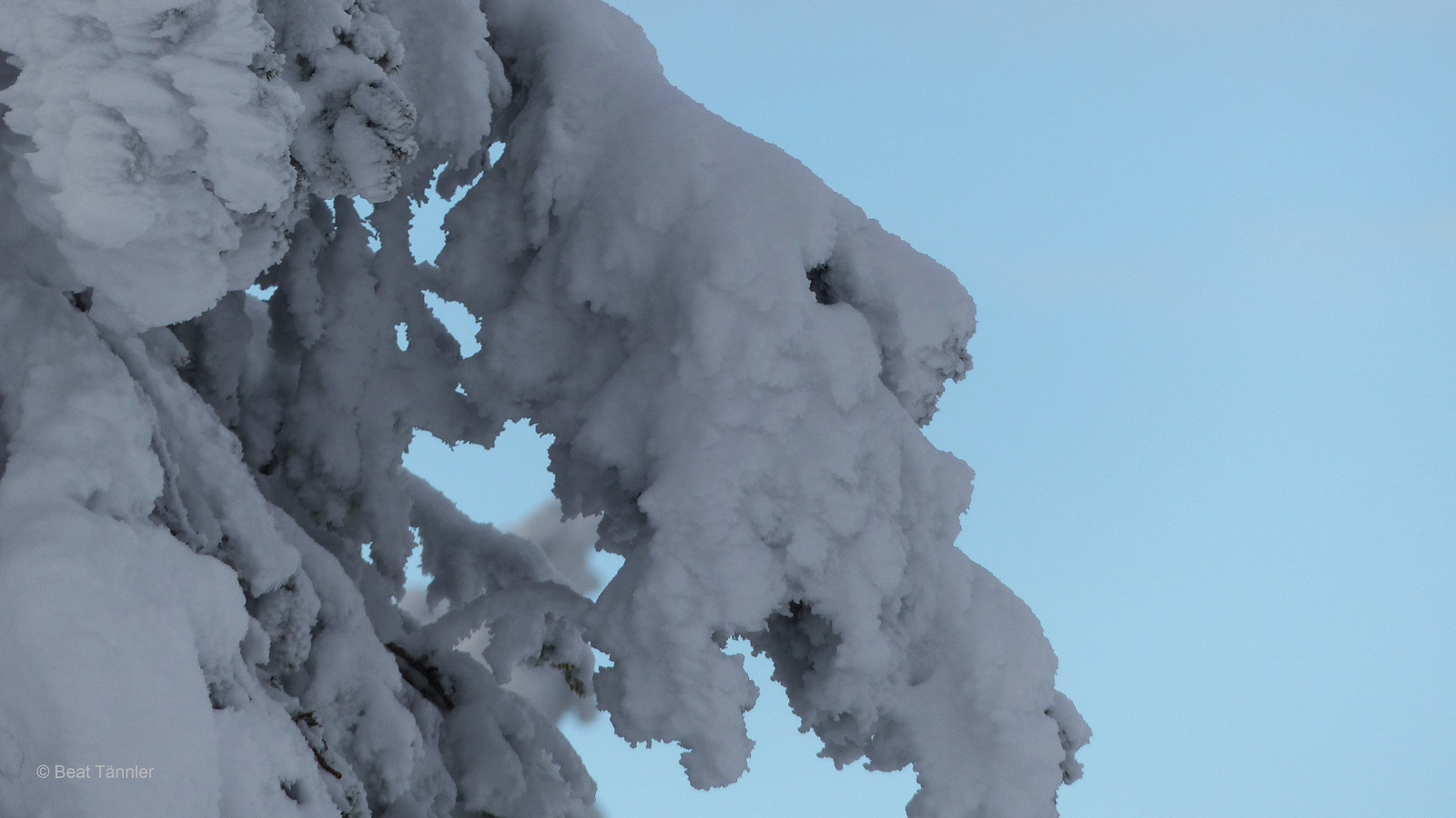 Auf der anderen Seite fahren wir durch einen Mischwald. Auf einer abgebrochenen Birke hat sich ein hoher Schneeberg angesammelt und sorgt so für eine naturgemachte Skulptur.